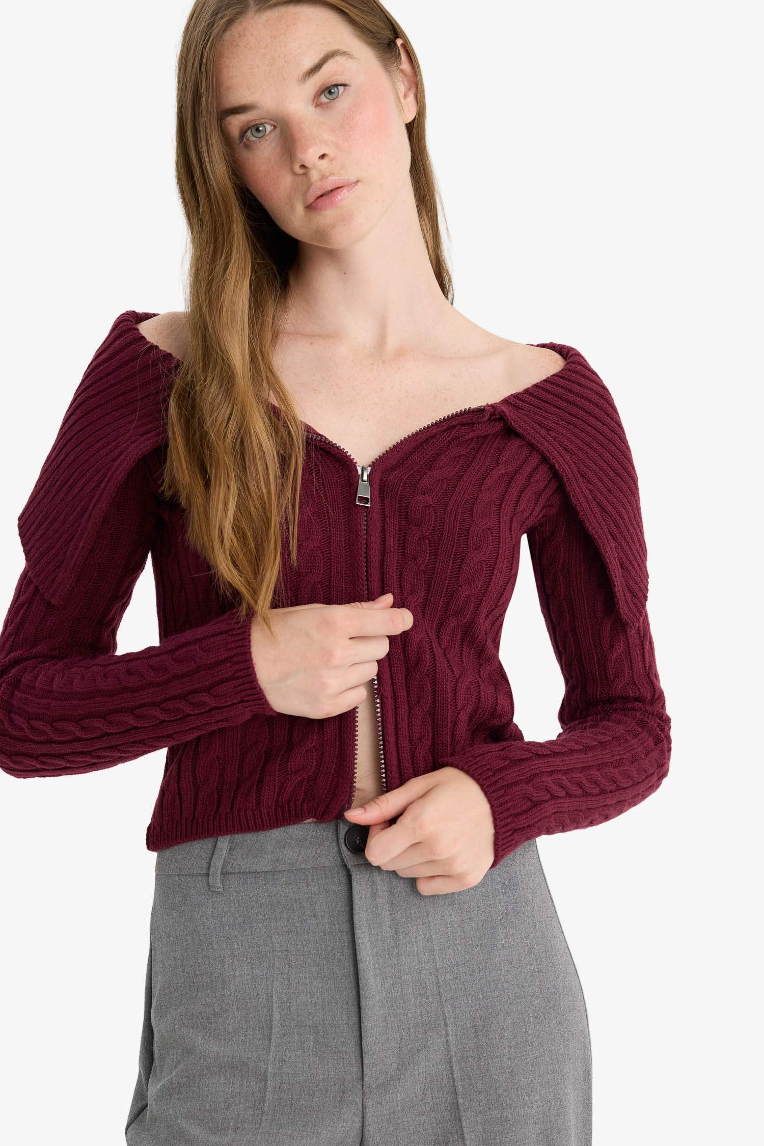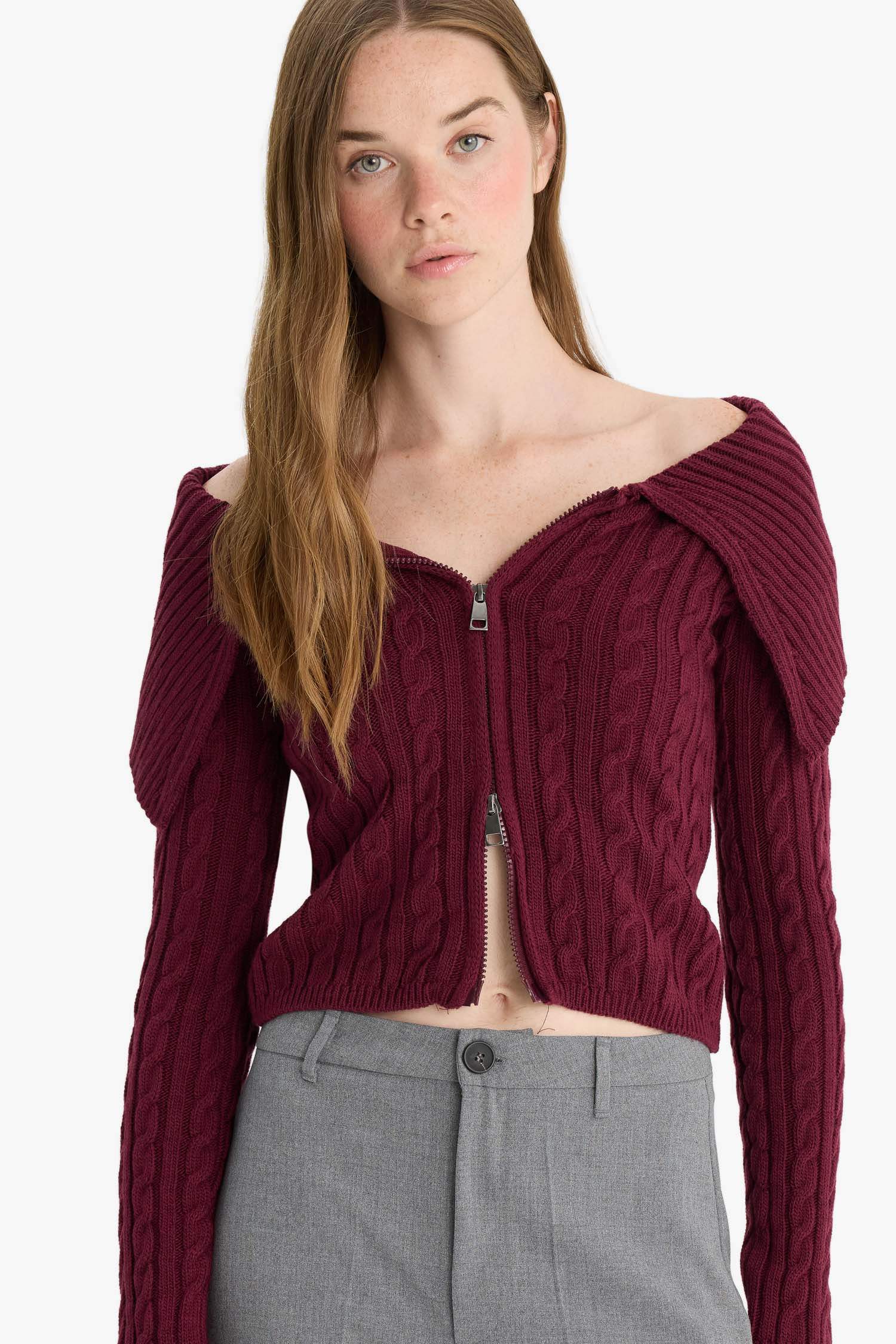Regular Fit Open Shoulder Zippered Knitwear Cardigan