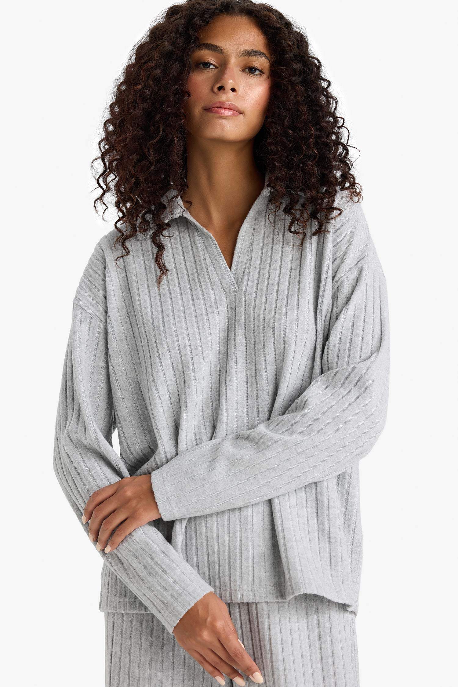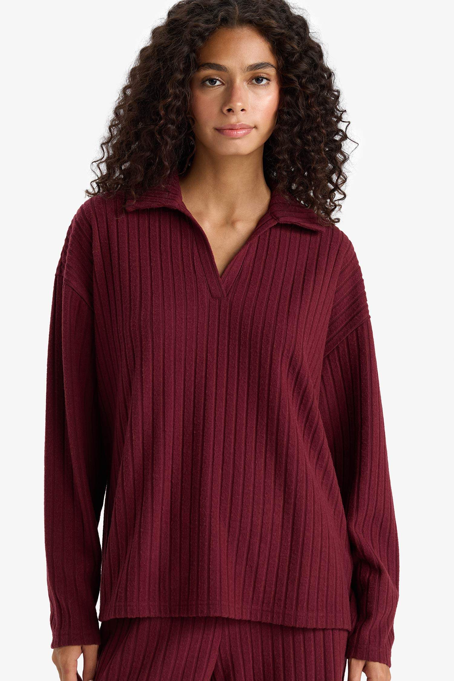 Relax Fit Polo Neck Ribbed Camisole Long Sleeve T-Shirt
