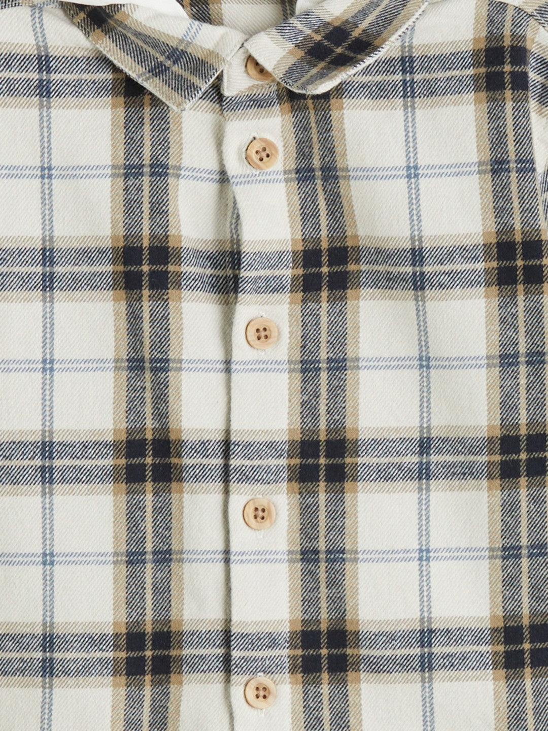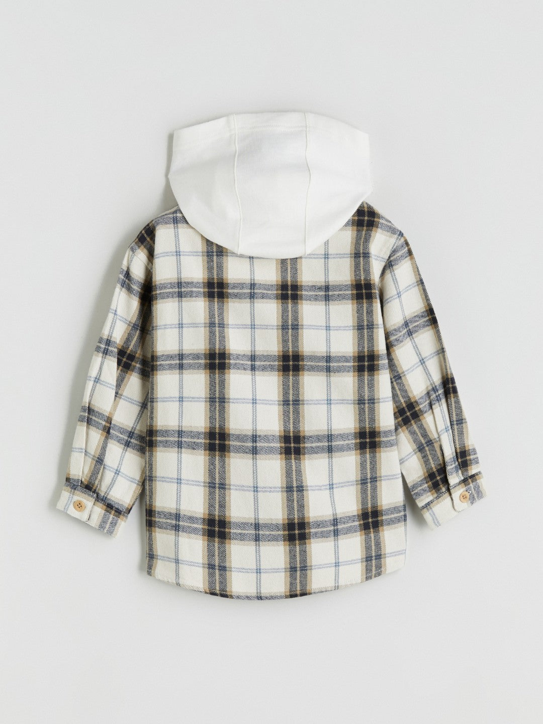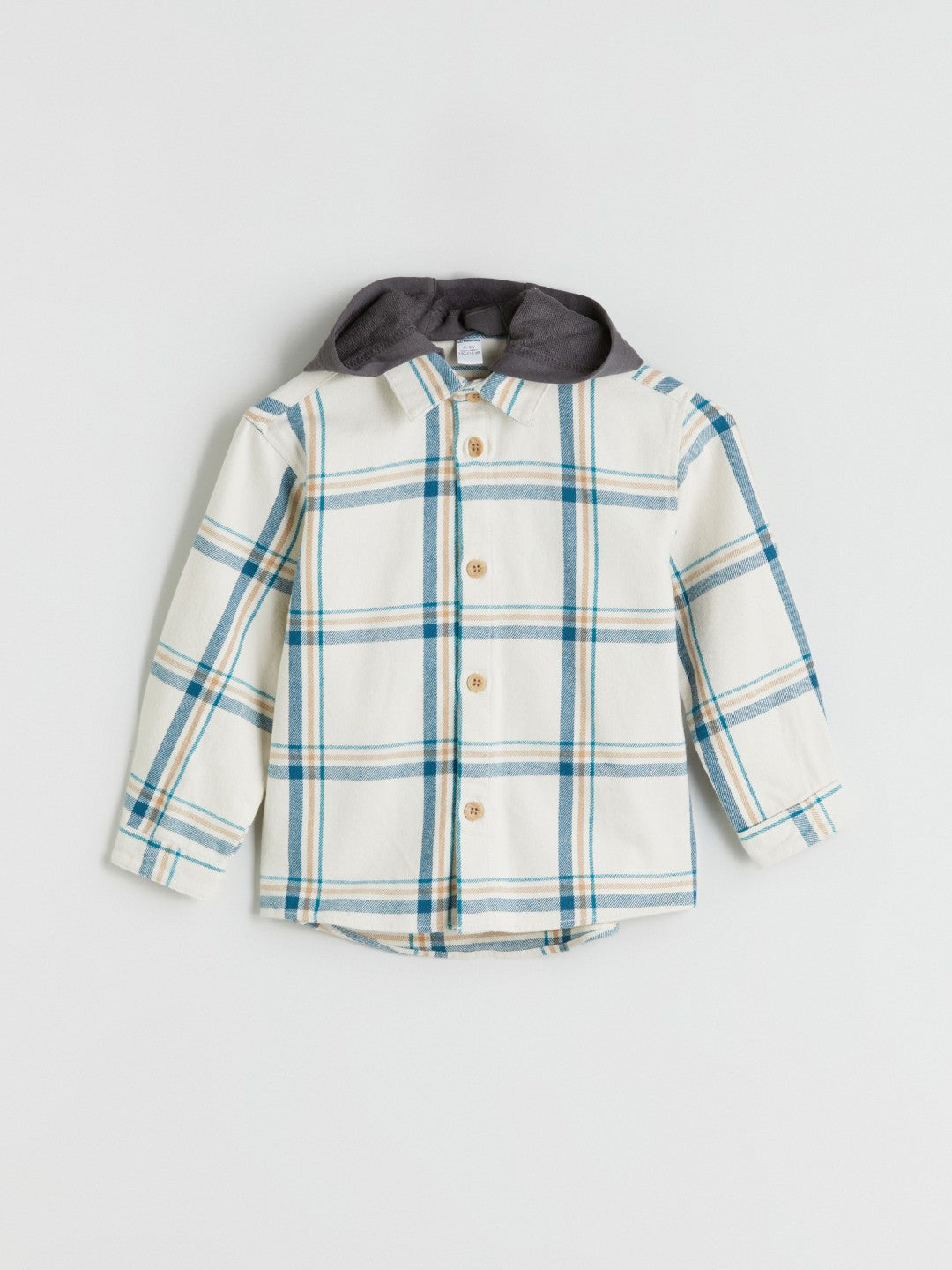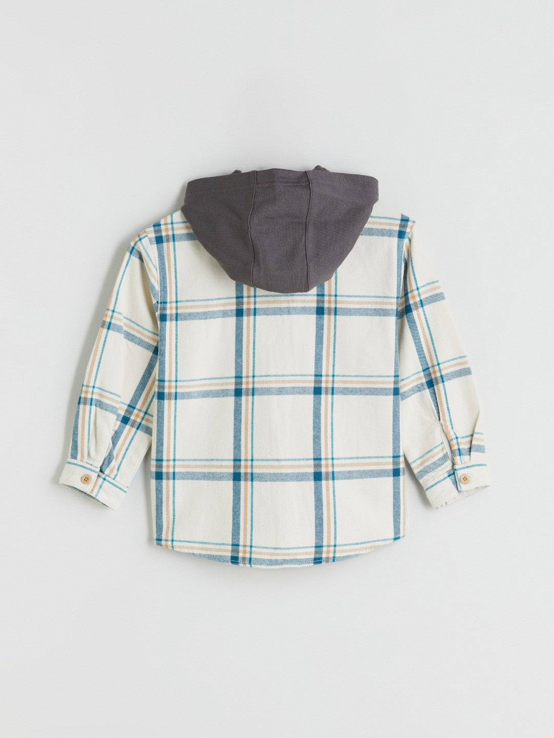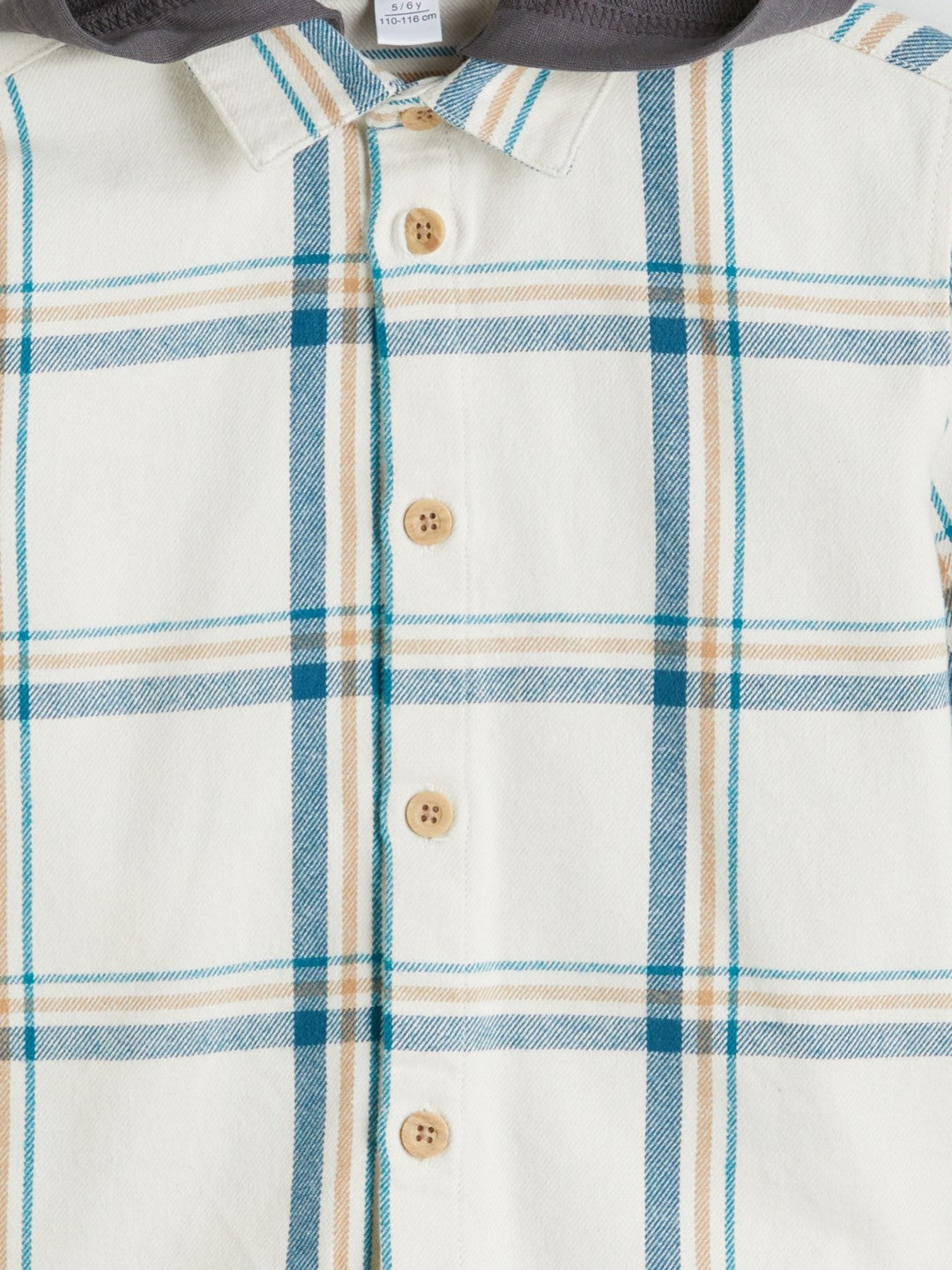 Plaid pattern, hooded and collared Boys shirt, made of 100% cotton flannel fabric It is long-sleeved and has button closure at the front