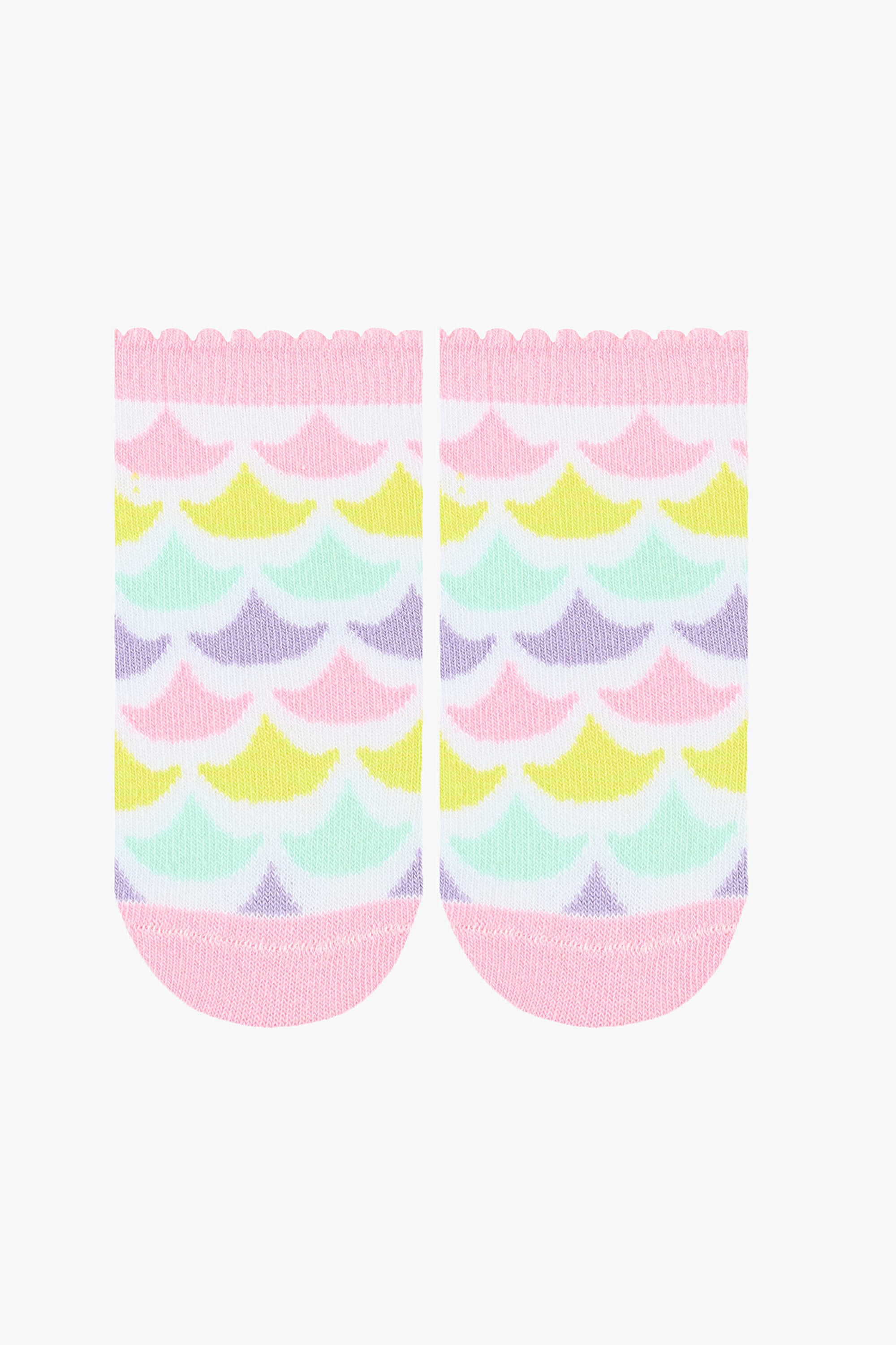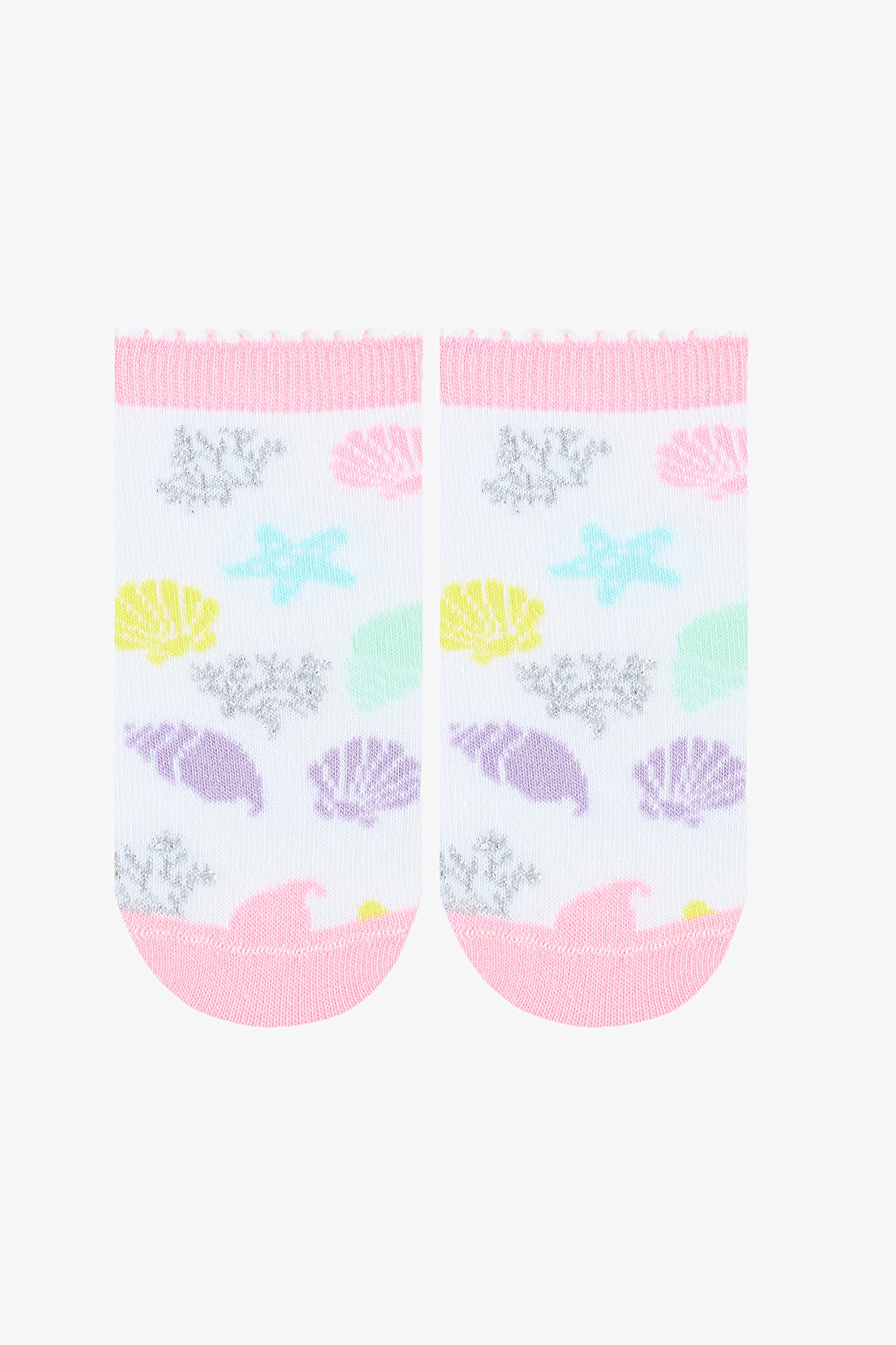 Mermaid 4-Pack Socks Set is a fun and colorful sock collection with a sea theme designed for girls. This set consists of four pairs of socks, each with a different design. The first sock stands out with seashell patterns in yellow, lilac, turquoise and green on a white background. The second sock stands out with a pink 3D seashell detail on a lilac background. The third sock brings the undersea world to the feet with a light pink 3D seashell on a turquoise background. The fourth and last sock is completed with multicolored seashell patterns on a gray background. This set is offered with the 11 for 2 campaign, so you can save when buying more socks. With its colorful and fun designs, the Mermaid 4-Pack Socks Set is a candidate to be the favorite of little mermaids. Don't miss this great opportunity now and add a sea breeze to your child's combinations!Material