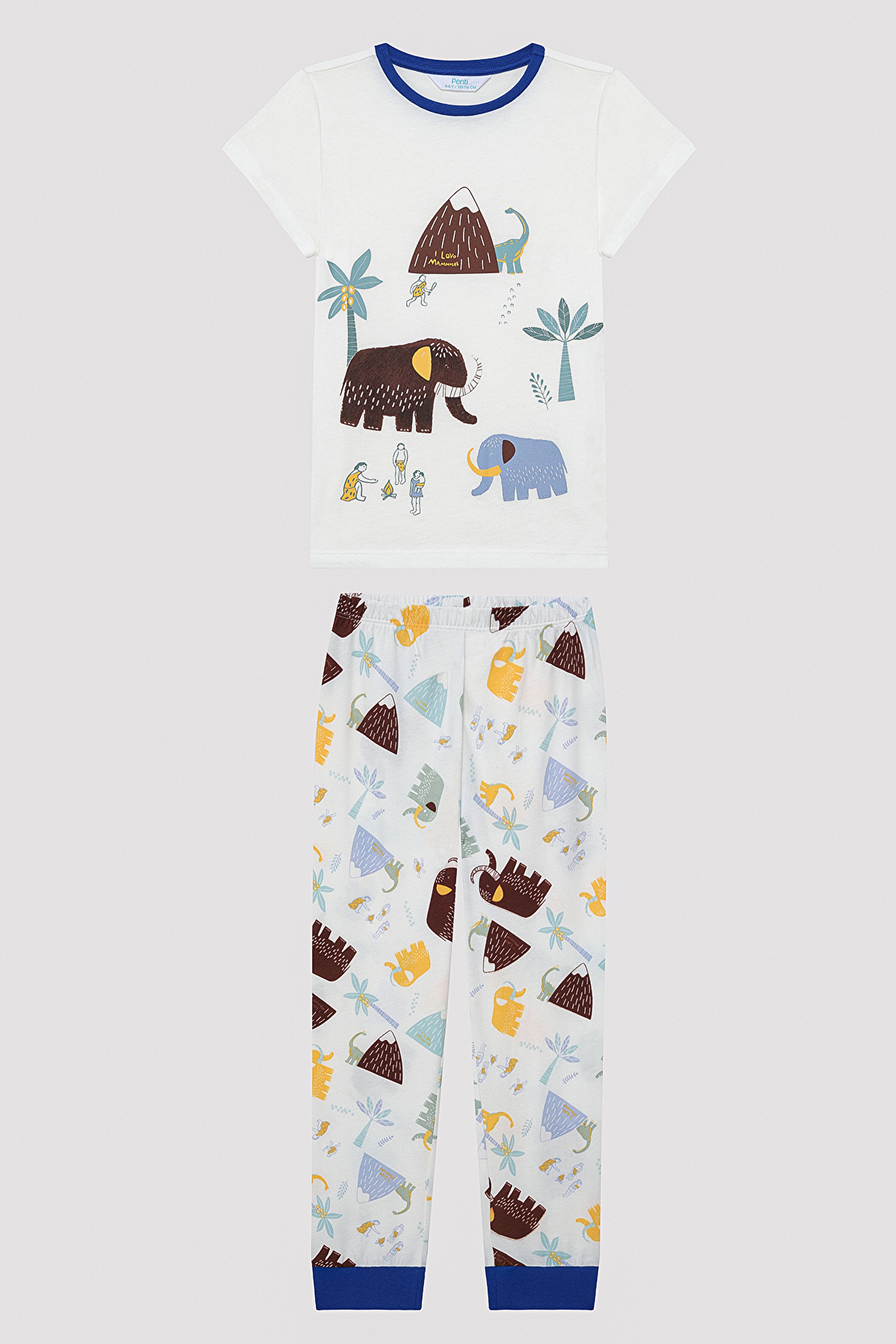 A story stretching from ancient times to the present day comes to life with the Mammoth Ls-SS 2-Piece Pajama Set. This pajama set is decorated with various colored mammoths and ancient human figures on the white upper part and different colored mammoth figures and trees on the lower part. On the top of the blue suit, there is a single large mammoth figure and the text "THE LAST MAMMOTH". This 4-piece pajama set, which stands out with its comfortable and stylish design, has been carefully designed in every detail. Mammoth Ls-SS offers a perfect sleeping experience by combining comfort and style. Get ready for a night full of legendary mammoths!Material