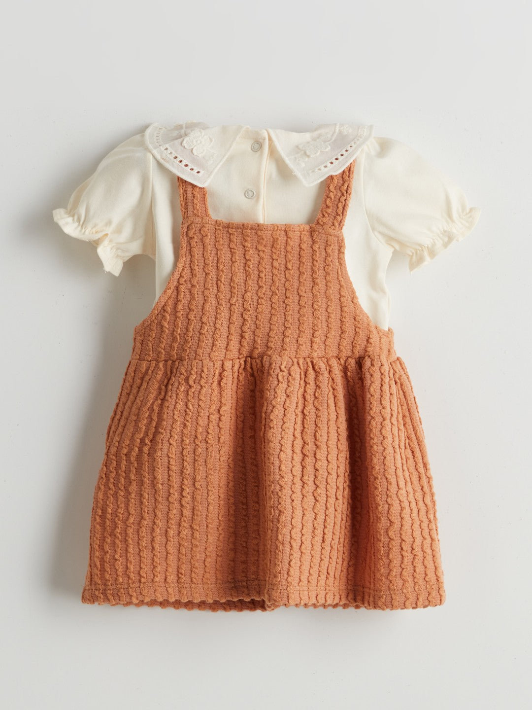 It will take its place in the wardrobe of the little ones with its elegant design. It provides skin-friendly and comfortable use thanks to its cotton blended combed fabric. The delicate embroidery details on the dress and blouse make the set special and complete the elegance of the little ones.