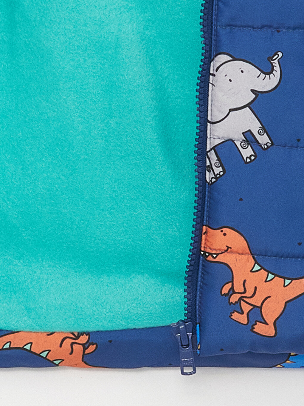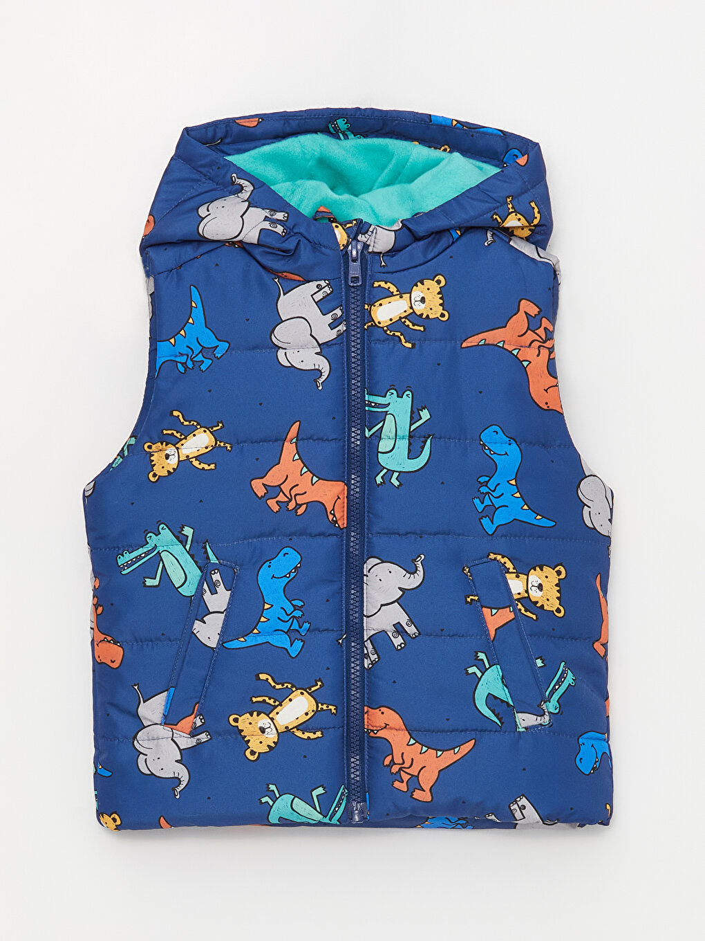 The hooded vest designed for baby boys offers practical use with its zipper with chin protection. The front pockets are a useful detail. It also provides a cute look with its dinosaur print.