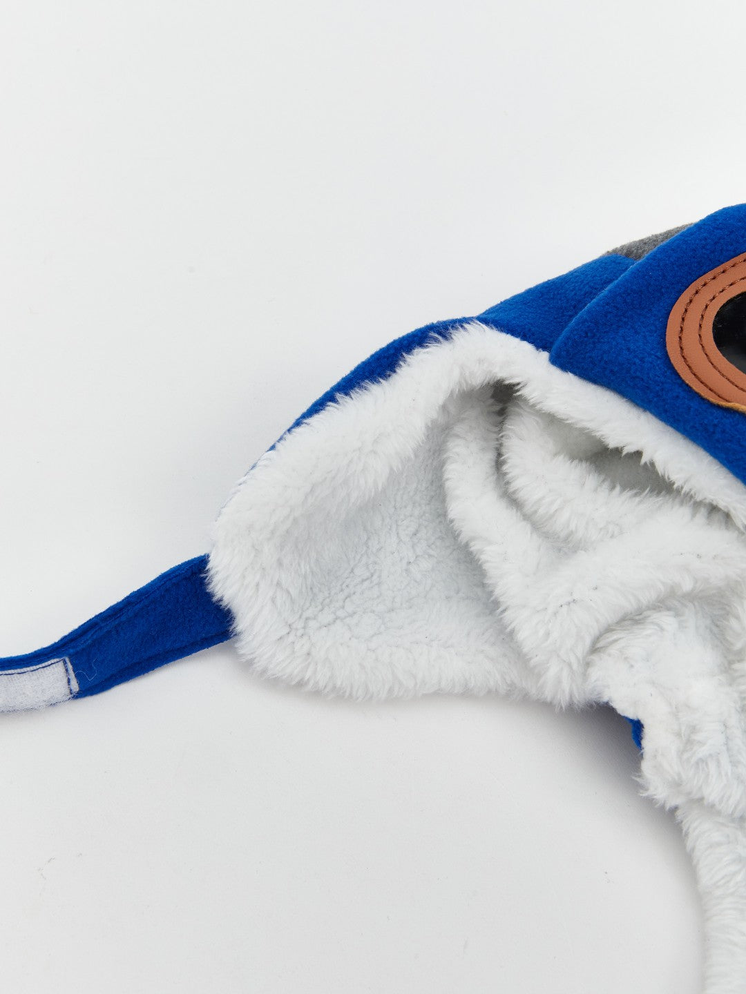 Quilted patterned boys snow hat with plush lining inside the ears and aviator glasses appliqués on the front. Velcro closure under the chin.