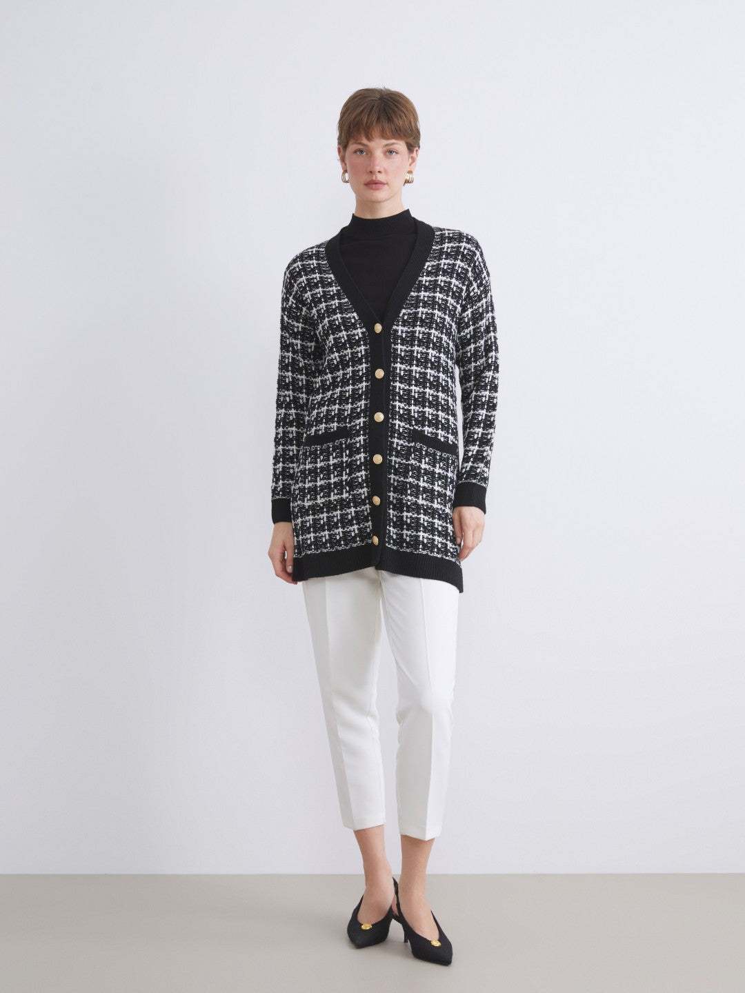 This long-sleeved, V-neck cardigan for women is made of knitwear. It features a button-down front, two pockets, and ribbing at the wrists and bottom.