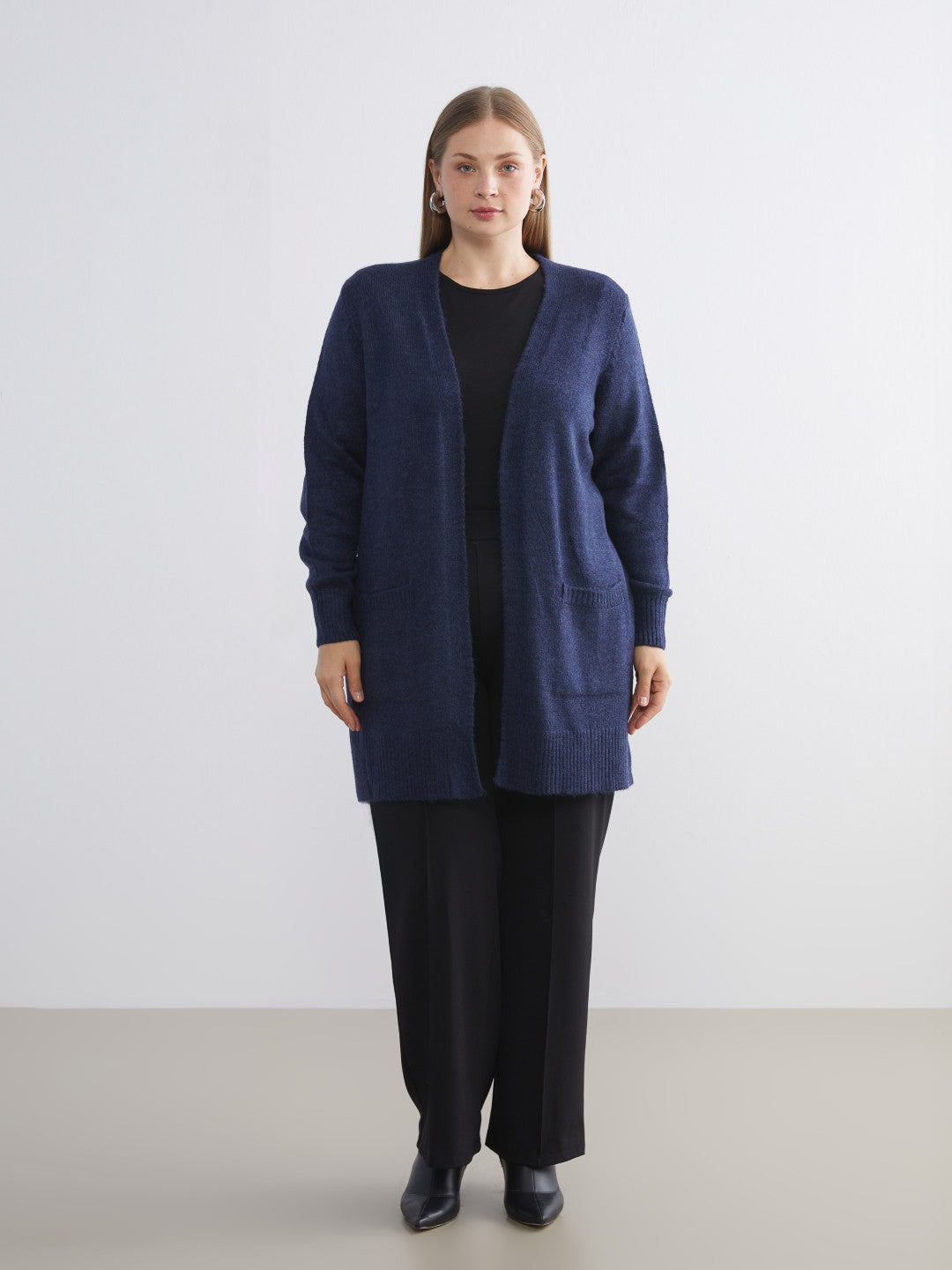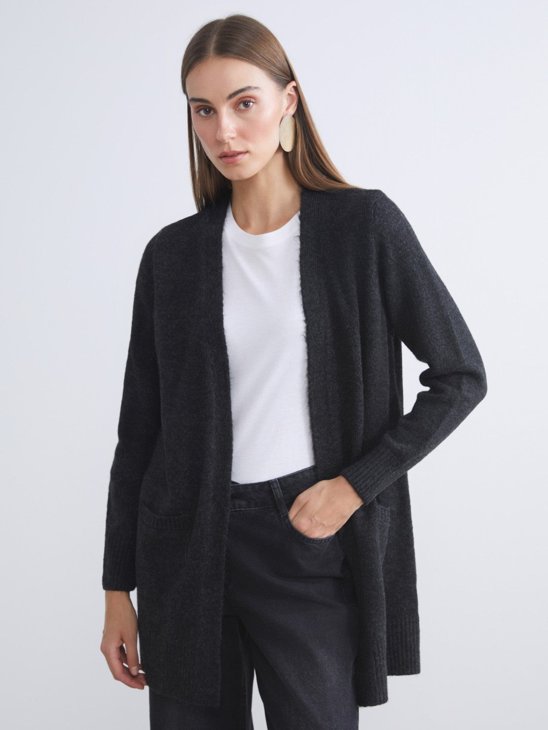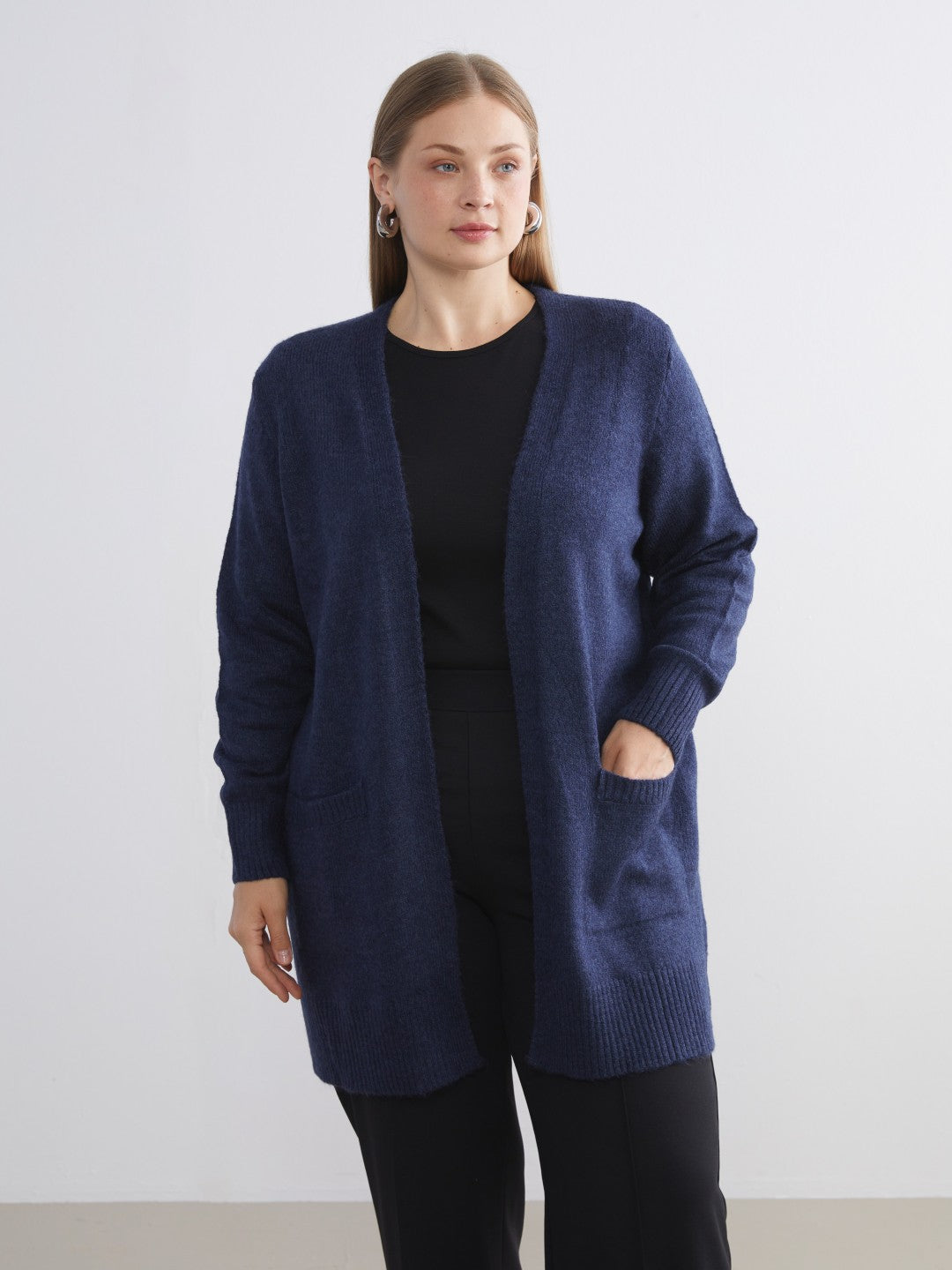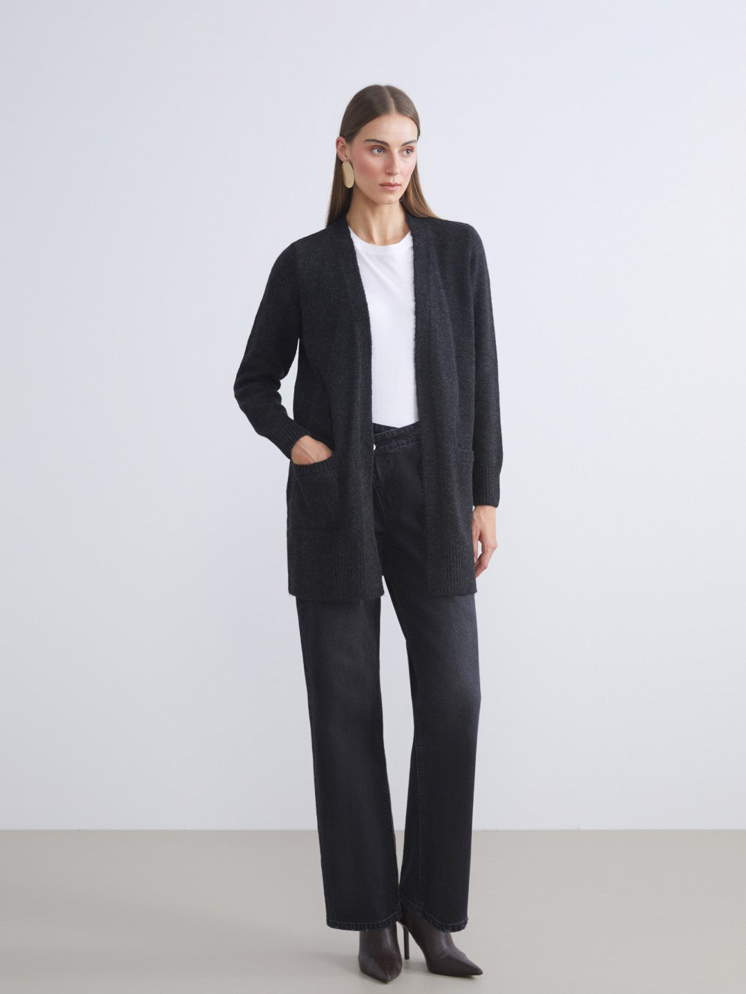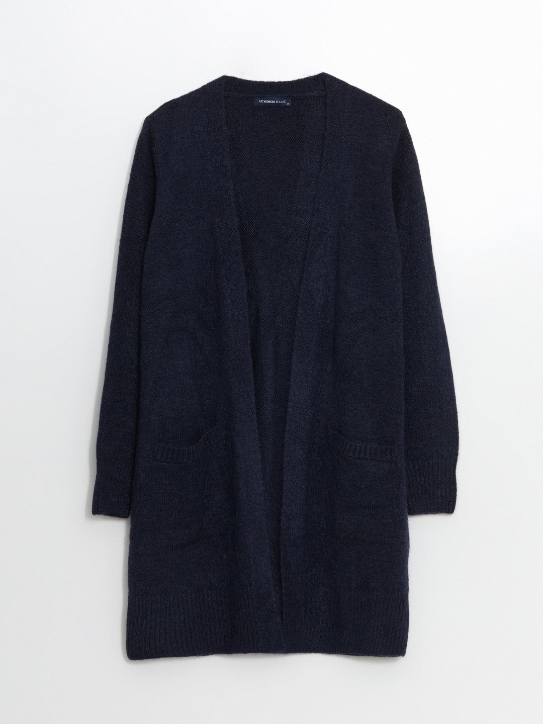 This shawl-collar, plain, long-sleeved women cardigan is made of knitwear. It features two side pockets and ribbing at the wrists and bottom.