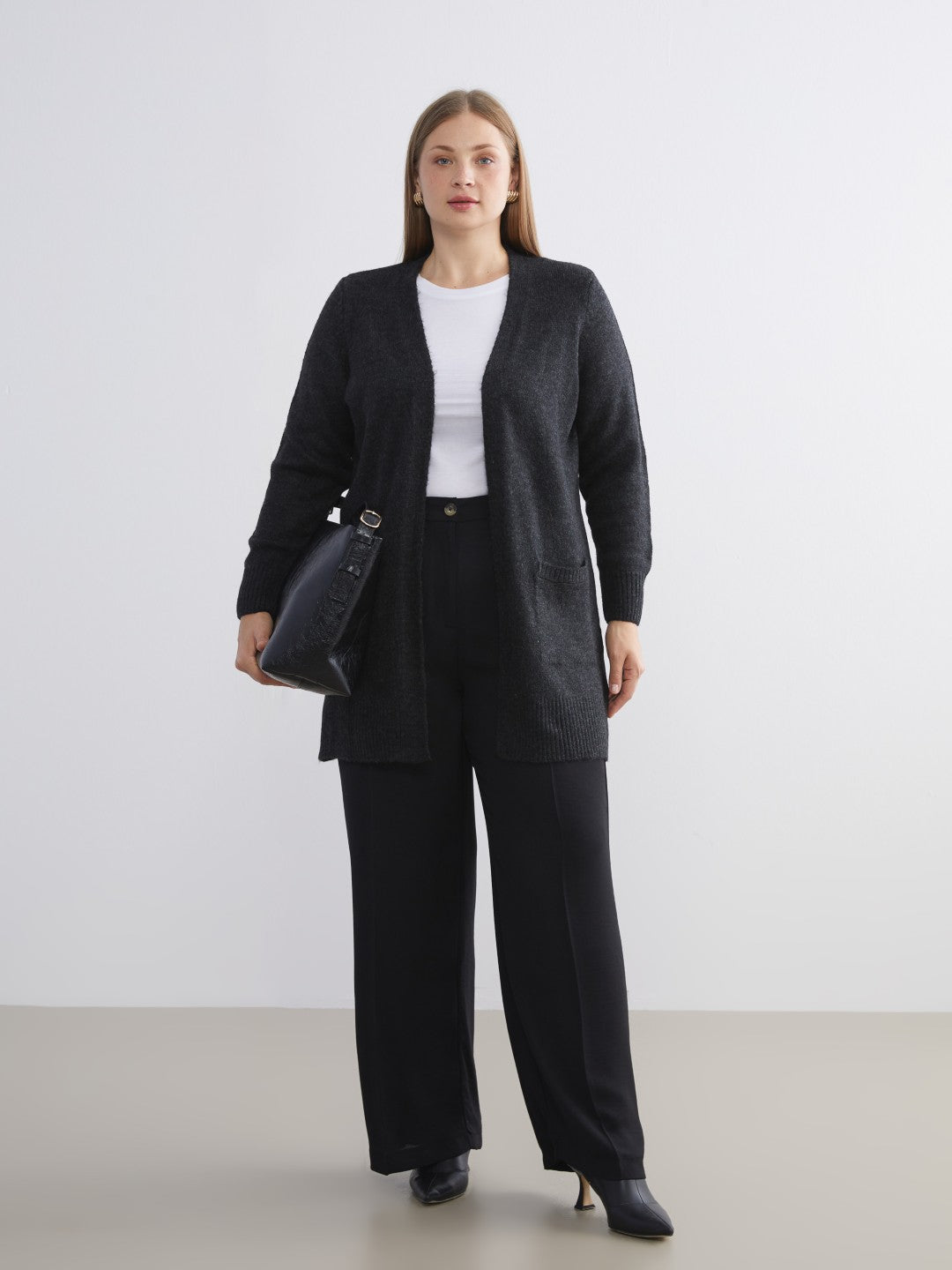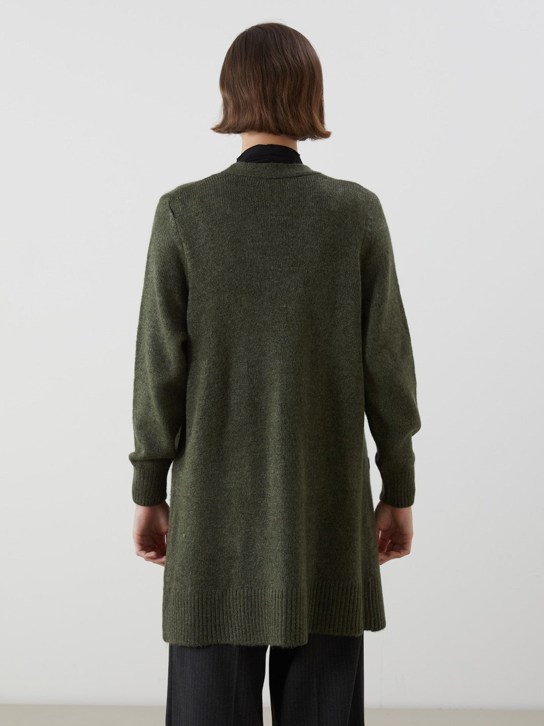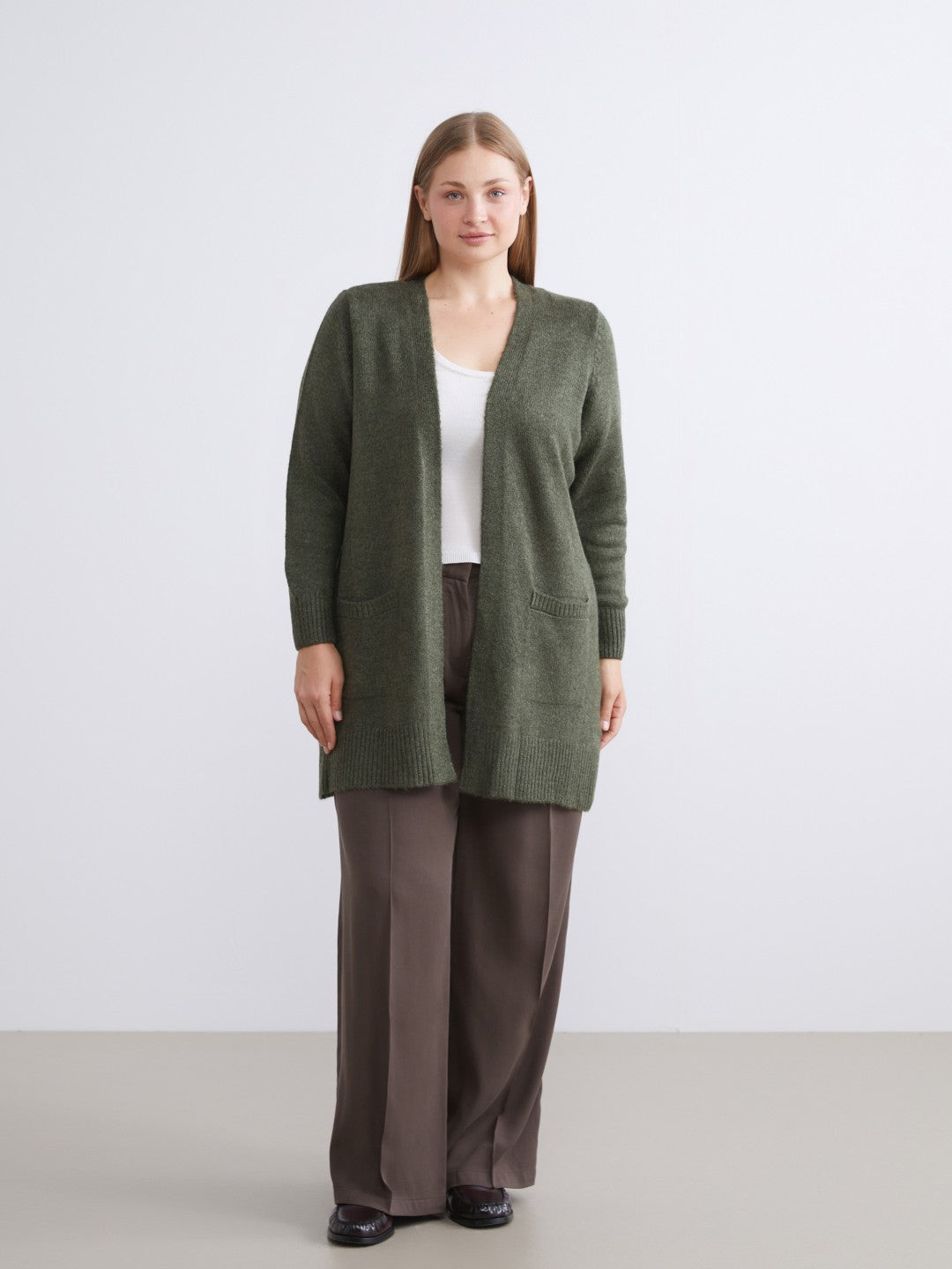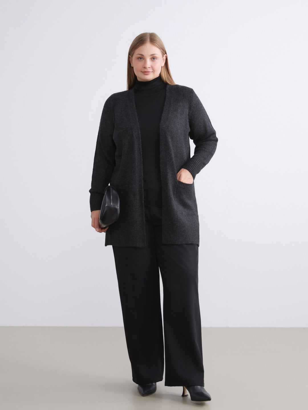 This shawl-collar, plain, long-sleeved women cardigan is made of knitwear. It features two side pockets and ribbing at the wrists and bottom.