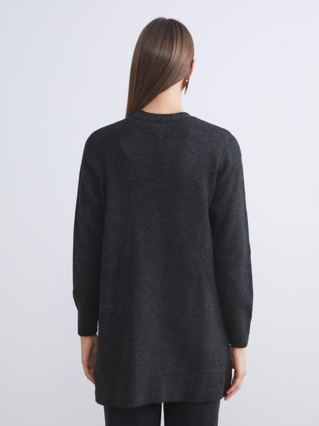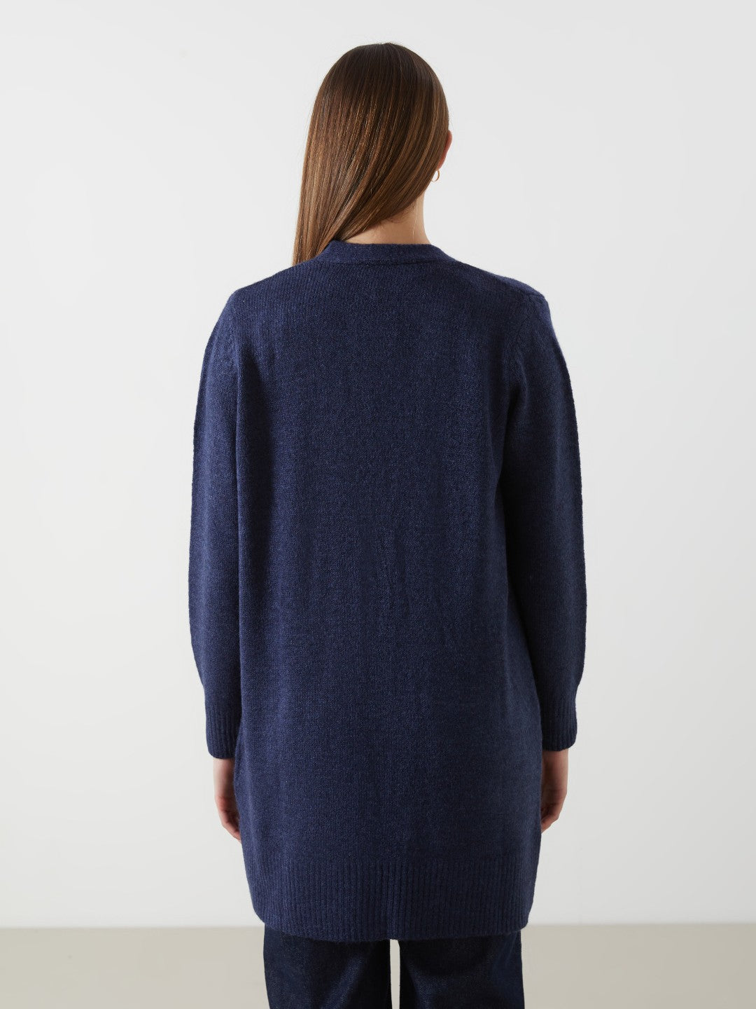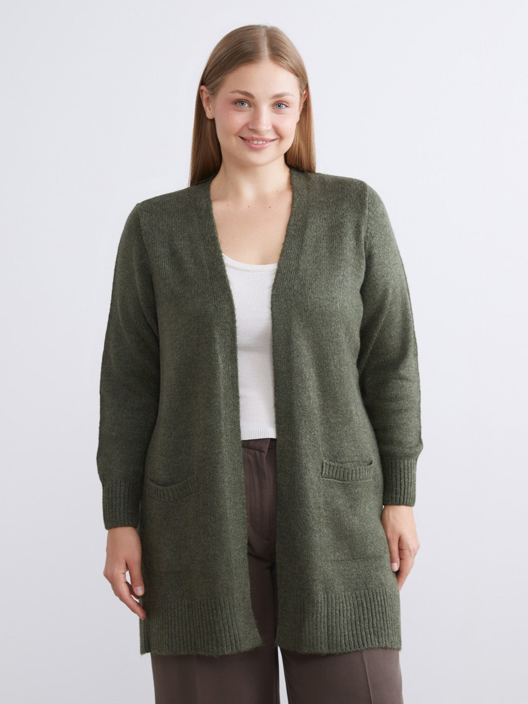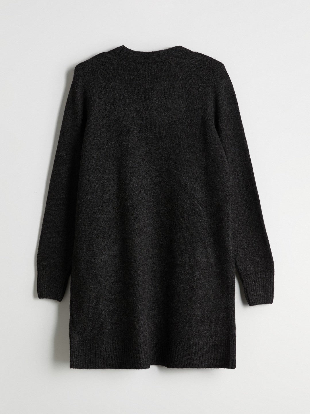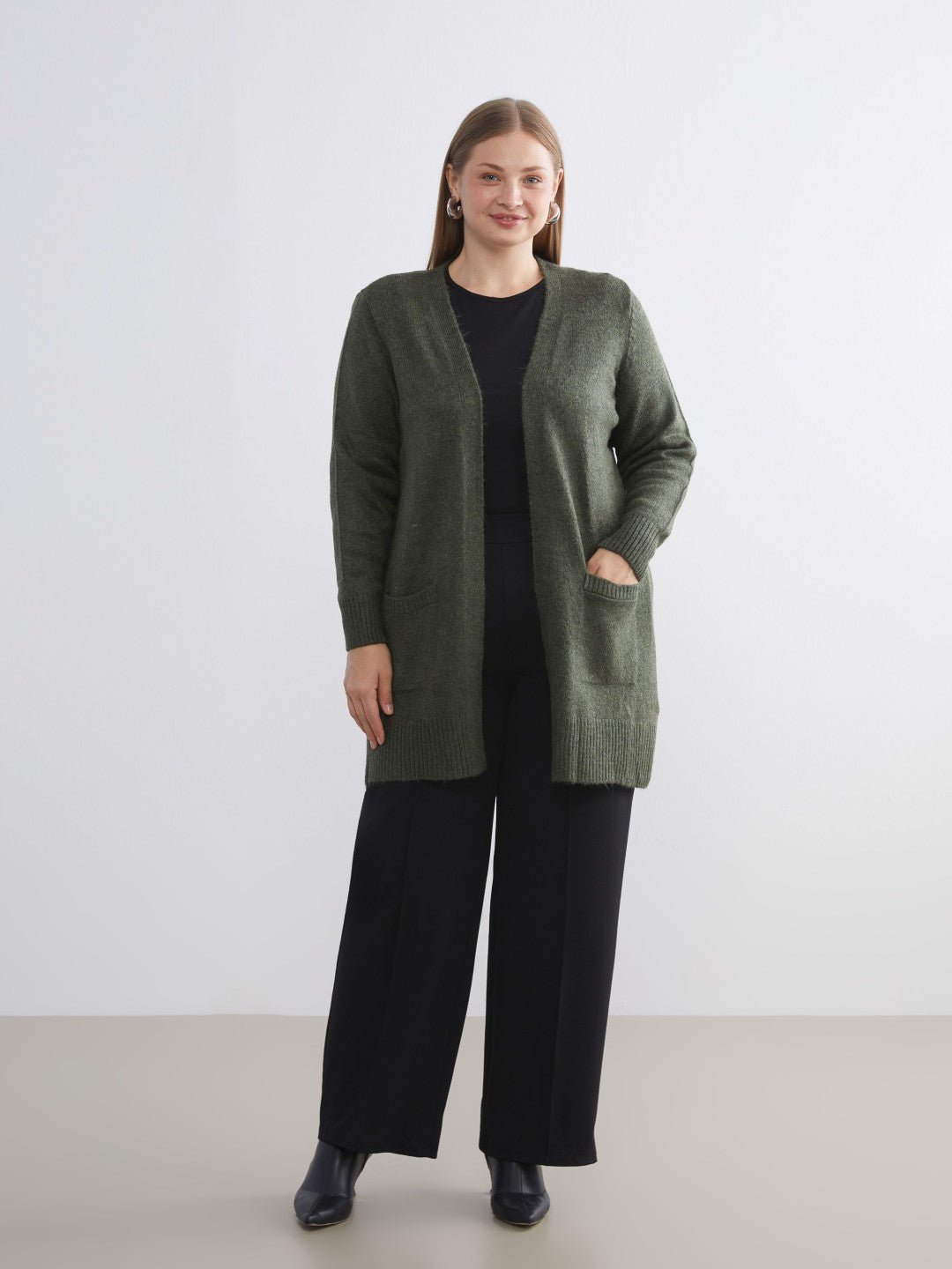 This shawl-collar, plain, long-sleeved women cardigan is made of knitwear. It features two side pockets and ribbing at the wrists and bottom.