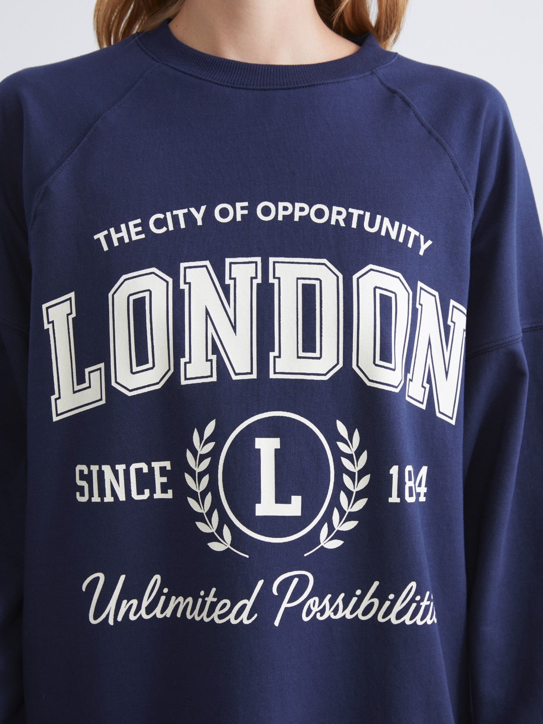 LCW Modest Navy Blue London Printed Oversize Women Sweatshirt Tunic