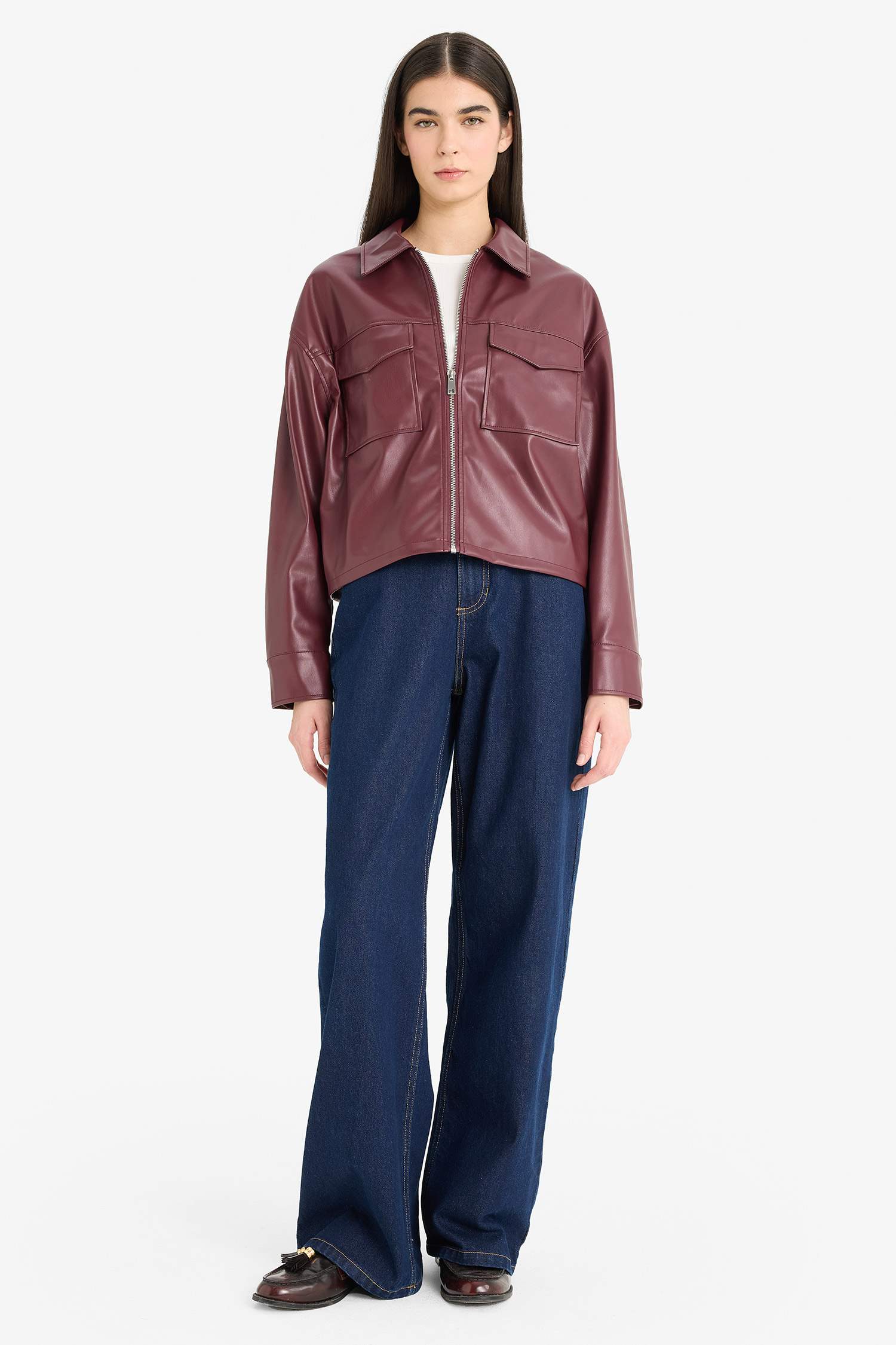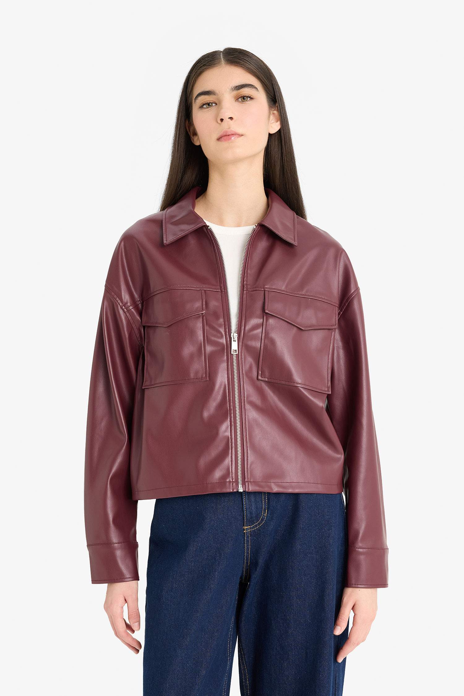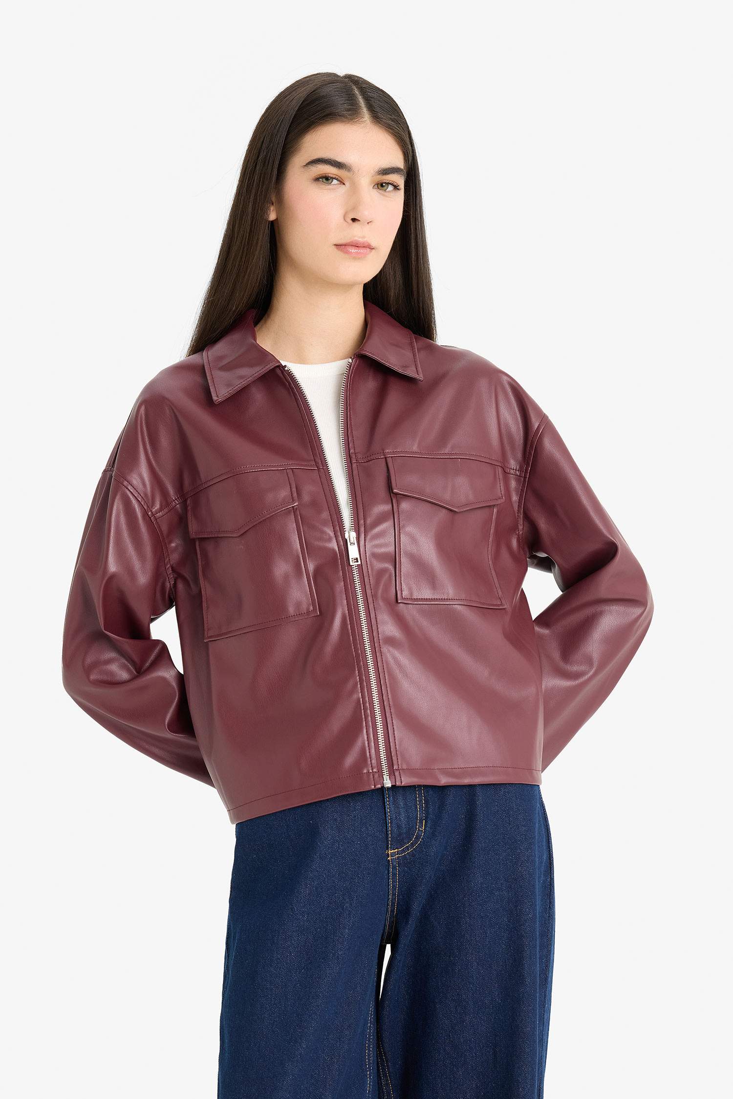 Regular Fit Shirt Collar Faux Leather Long Sleeve Shirt