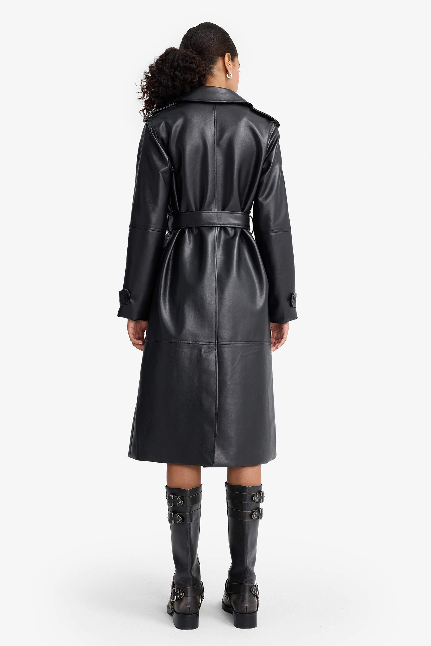Regular Fit Faux Leather Buttoned Pocket Long Trench Coat