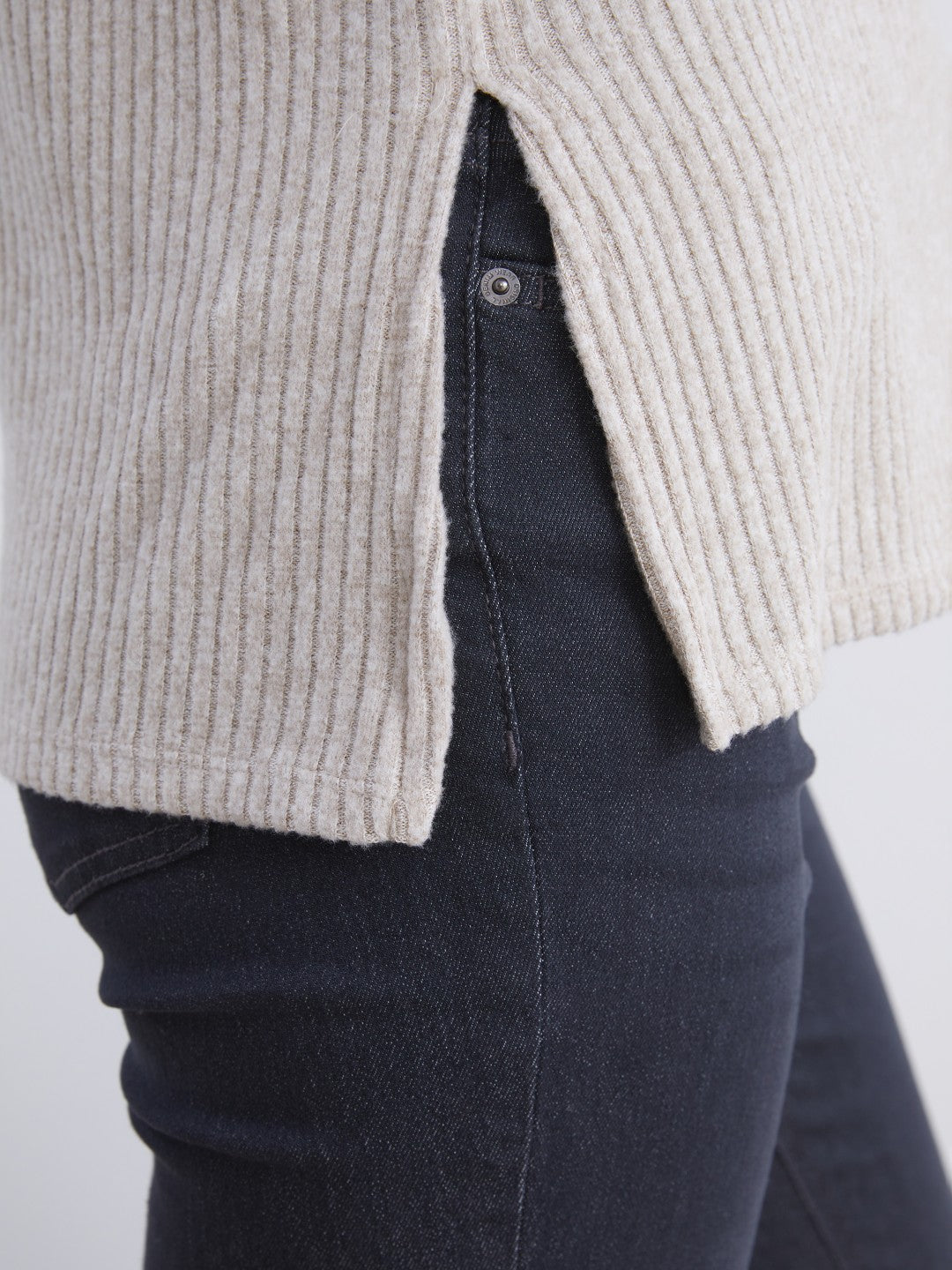 Women polo neck and long-sleeved t-shirt is made of thick ribbed fabric and has side slits