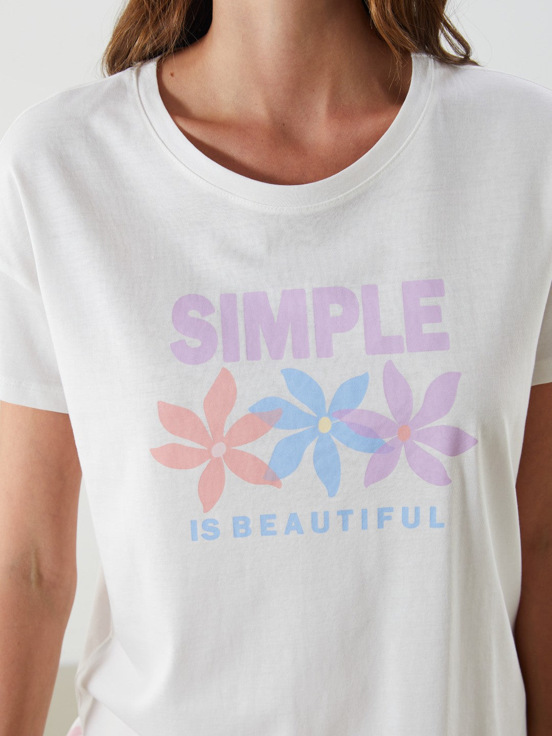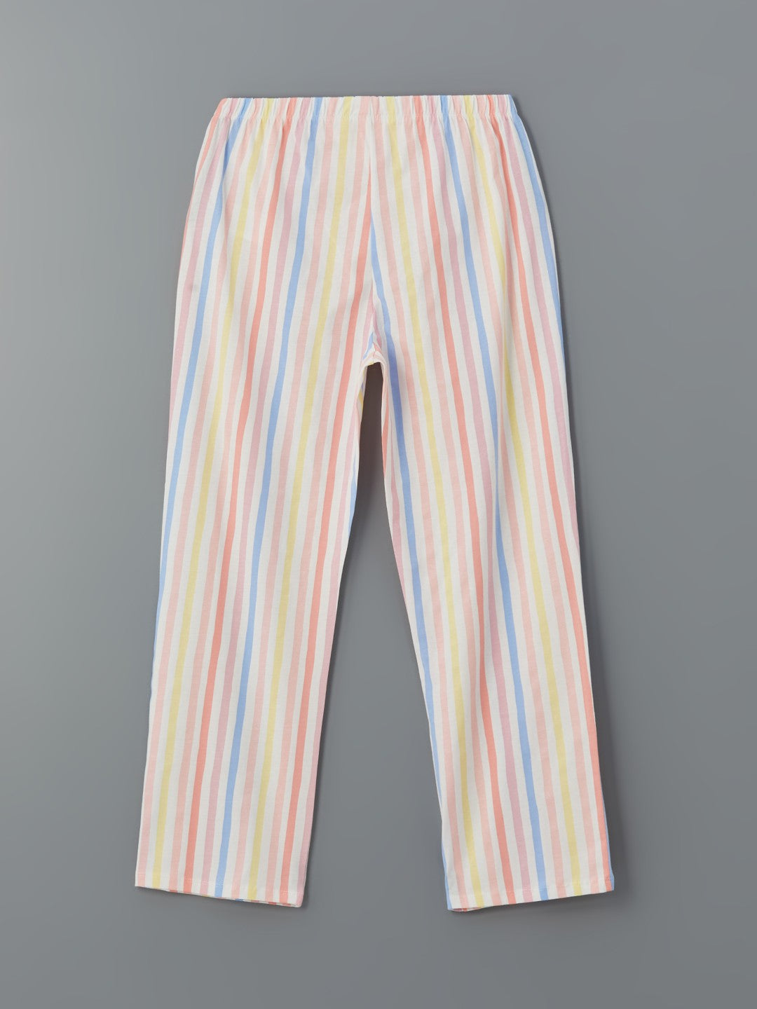 It is a 2-piece pajama set consisting of a crew neck printed pajama top and striped pajama bottoms. It fits perfectly to the body with its elasticated waist design. Designed to provide a comfortable sleeping experience.