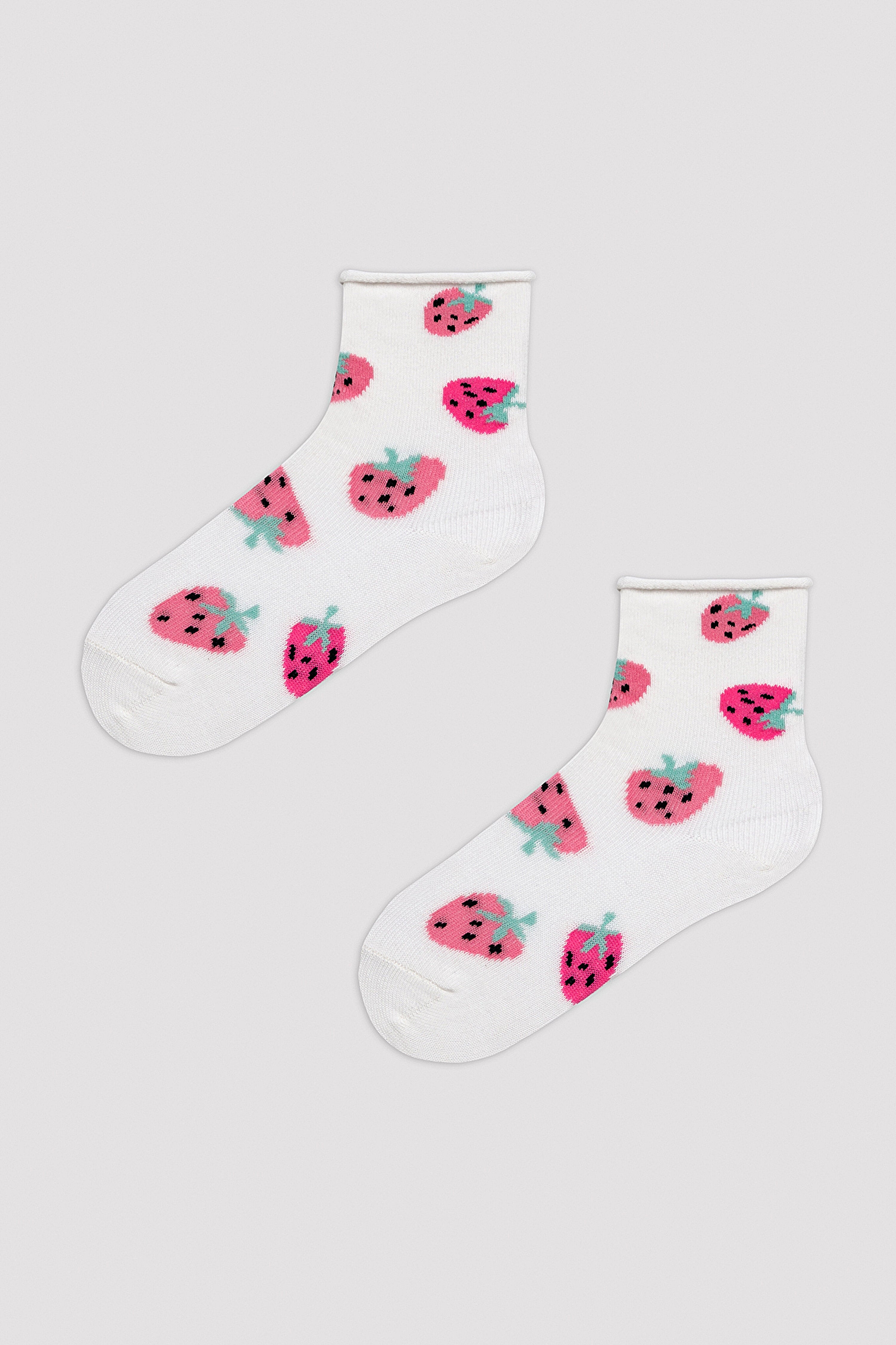 Strawberry 3-Piece Sock Socks, this white colored sock set consists of three pairs of socks, each with a different design. The first pair features a sweet cherry pattern on the ankle and a polka dot sole. The second pair offers an energetic look with stripes of different colors on white. The third pair evokes summer with strawberry figures placed on a white background. This sock set, which is both stylish and fun, will allow you to reflect your style with every step! Material
