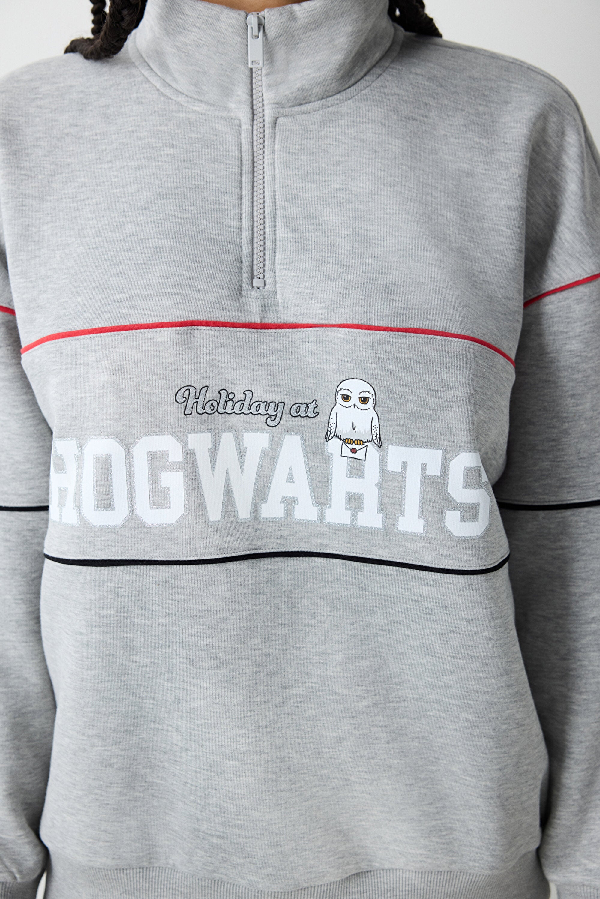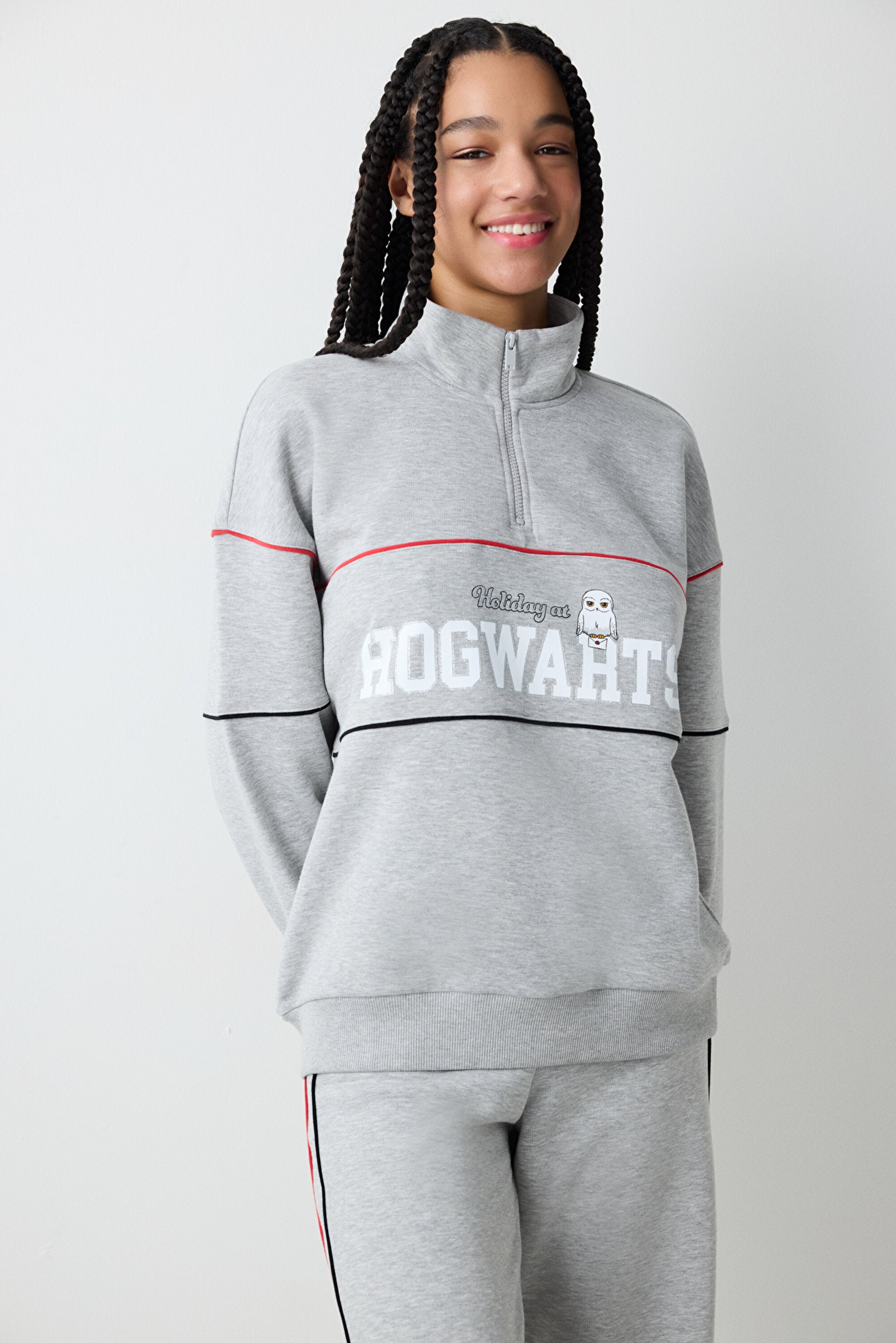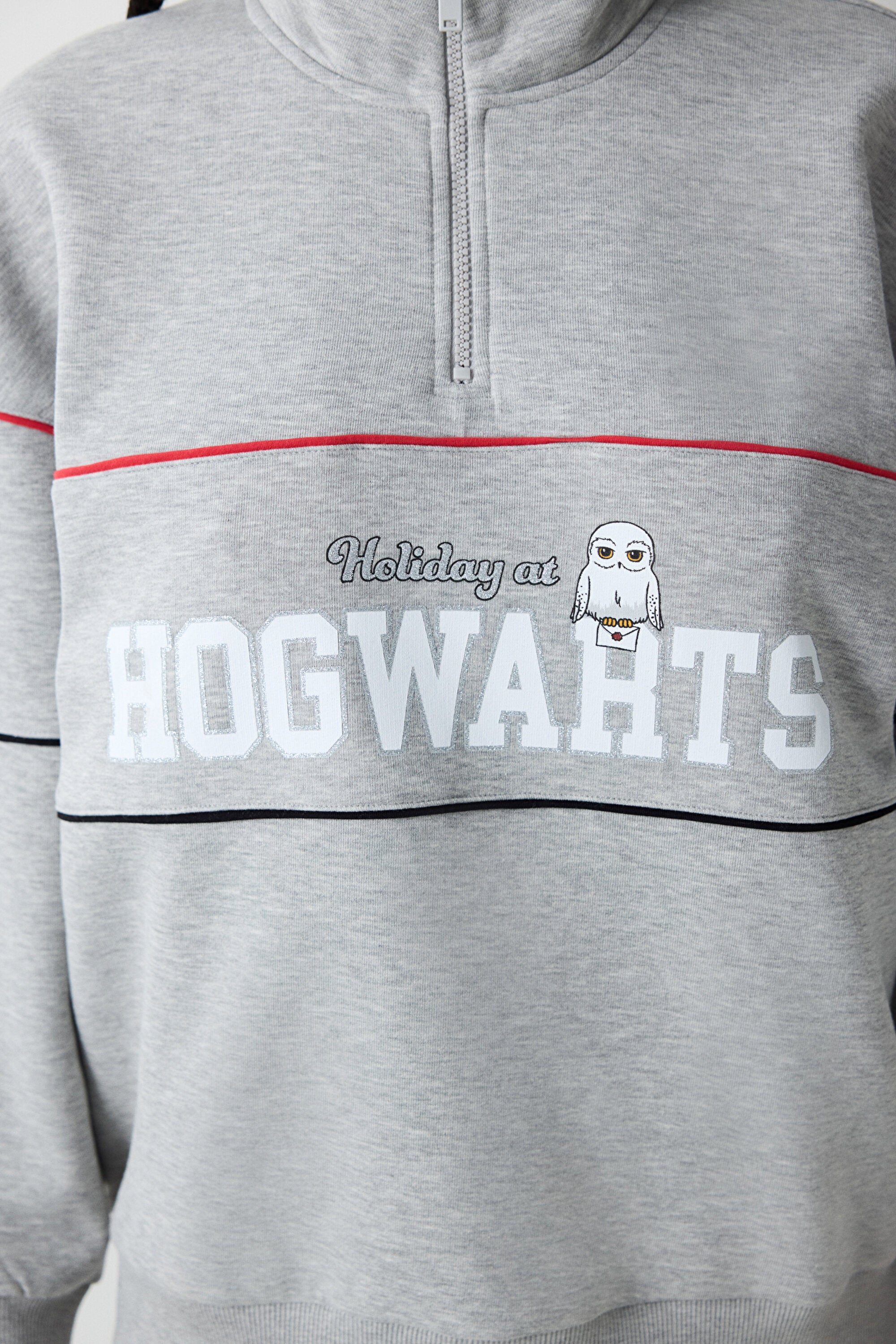 HP Piping Sweatshirt has a grey melange color and slogan print design. This sweatshirt is made of cotton grown with ethical farming practices that respect nature and people. It offers medium level comfort thanks to its regular fit cut and has a long sleeve structure. This product, which makes a difference with its zippered stand-up collar detail, is designed for Harry Potter fans. An ideal option for those who want to have both a stylish and comfortable style, HP Piping Sweatshirt offers both stylish and comfortable use.Material
