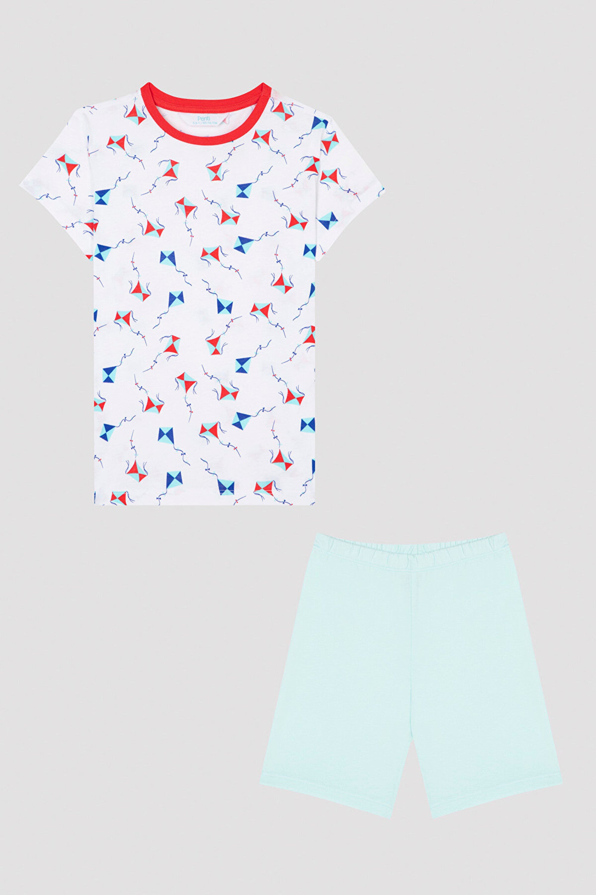 Kites Ck Sss 2 Pack Pj Set is a pajama set that is part of the April 23 Collection, allowing children to complete their home style with a cute and cheerful look. Thanks to its 100% cotton fabric, it attracts attention with its features that protect people, nature and the world. Thanks to its soft feel, it completes every moment of the day with comfort and convenience, while also allowing children to have a pleasant experience. The set consists of 4 pieces: 2 tops and 2 bottoms. The kite print and slogan details adorning its design give the pajama set a cute and colorful look. Material