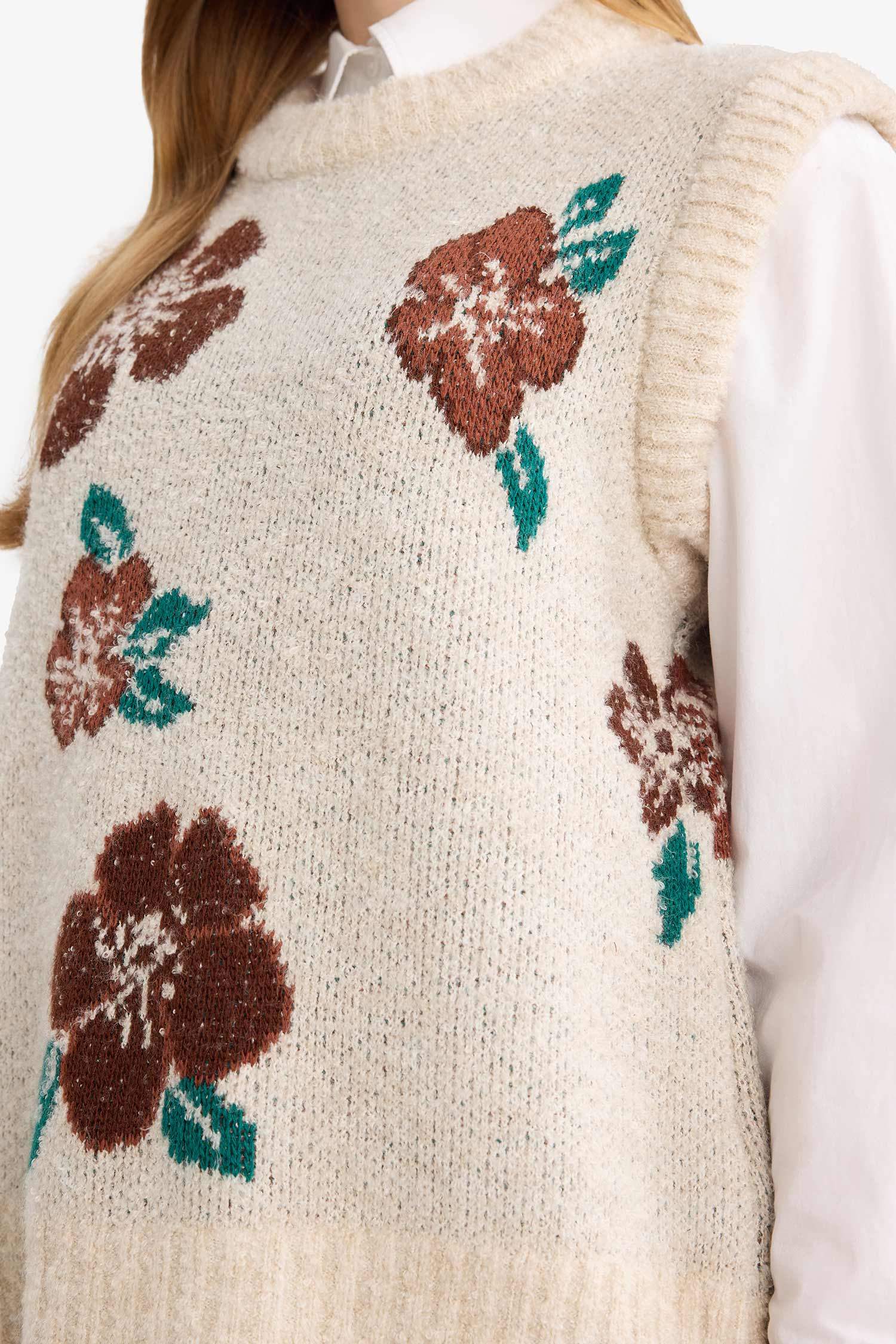 Regular Fit Crew Neck Floral Pattern Knit Sweater