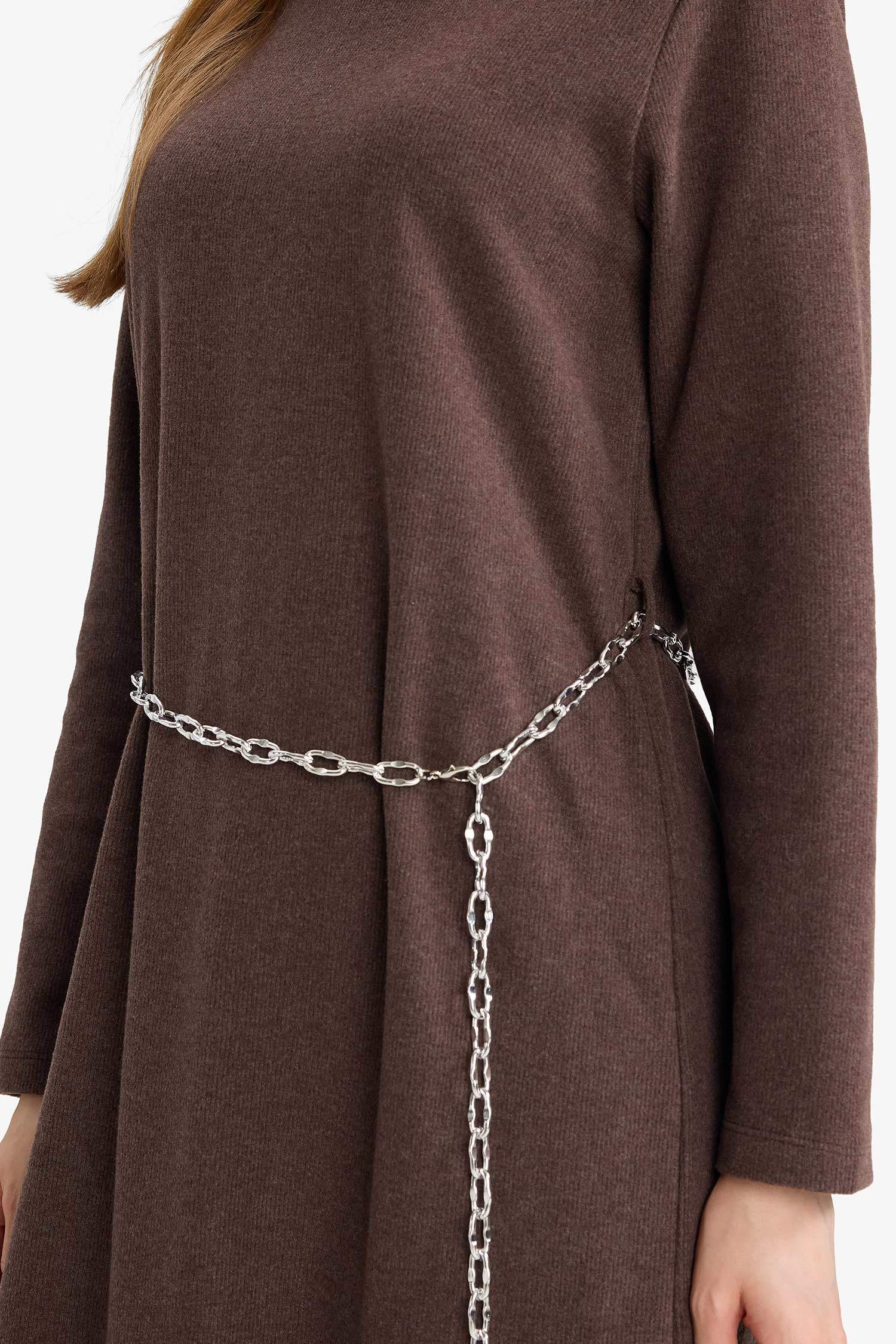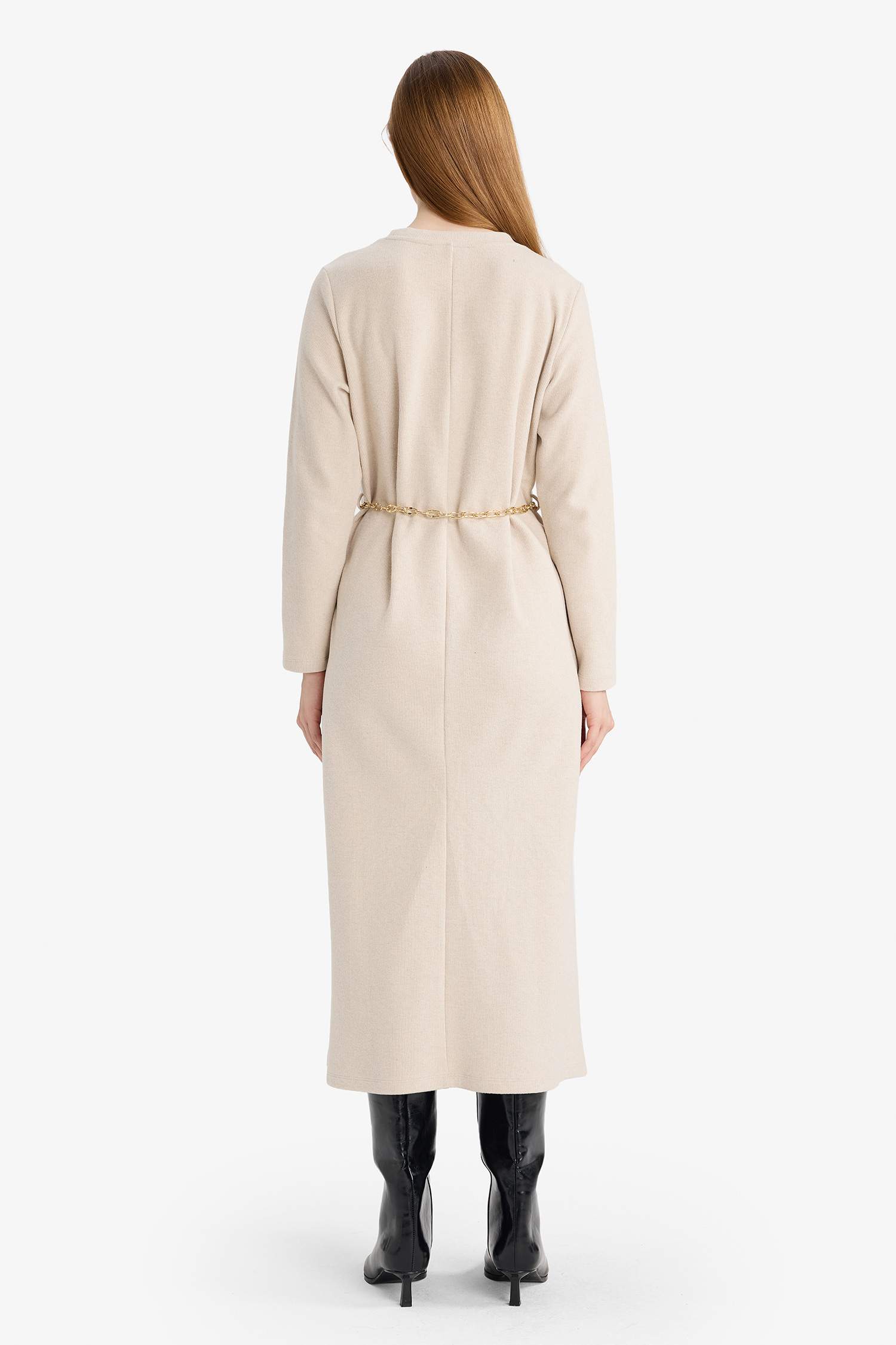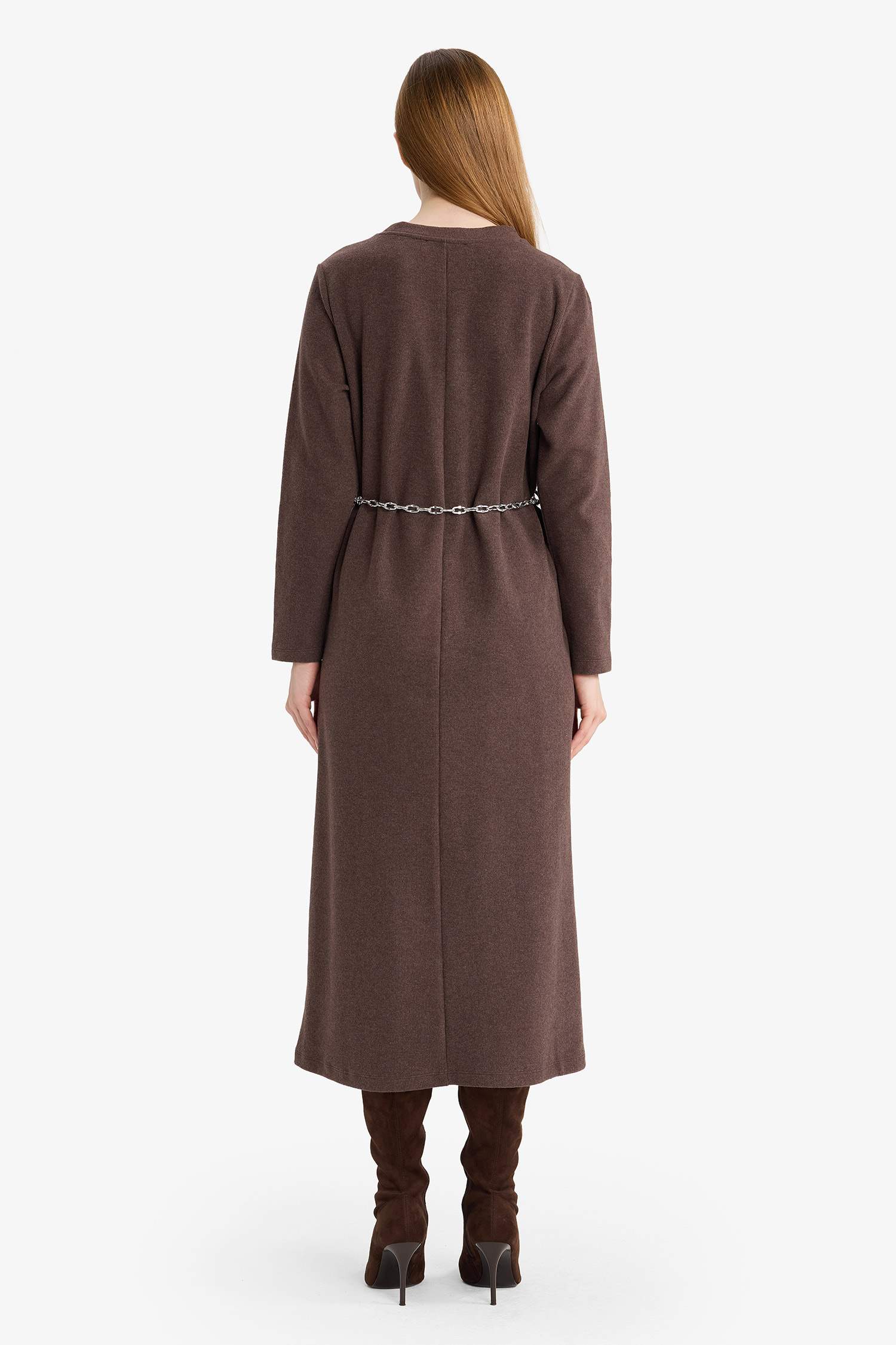Regular Fit Crew Neck Long Sleeve Belted Maxi Dress