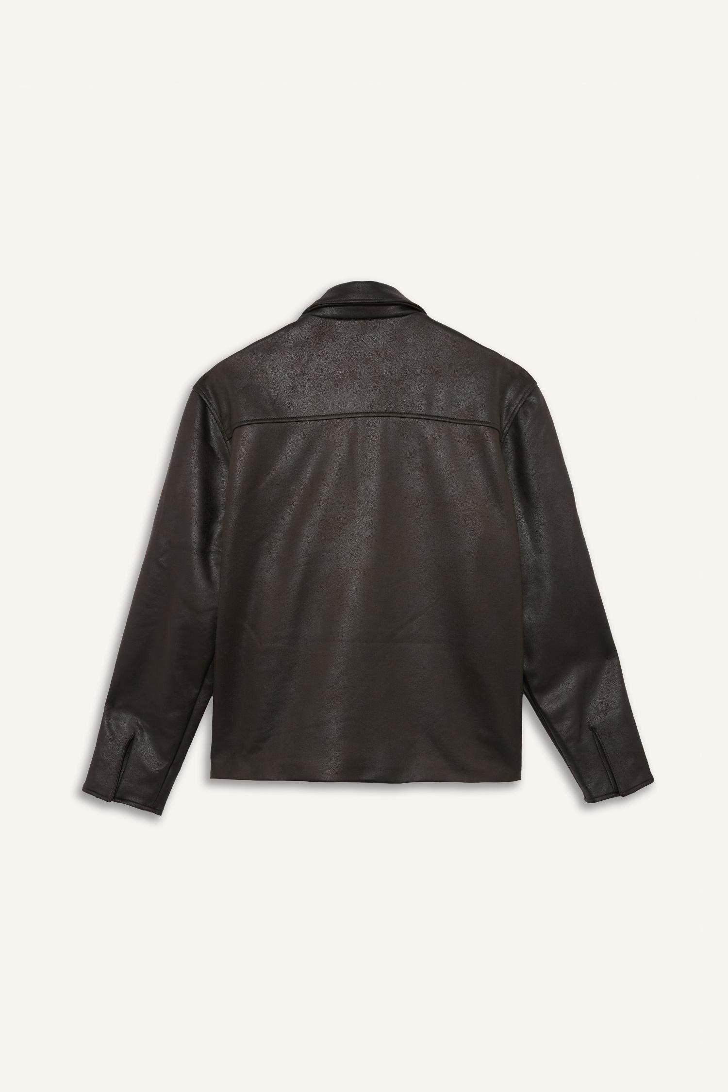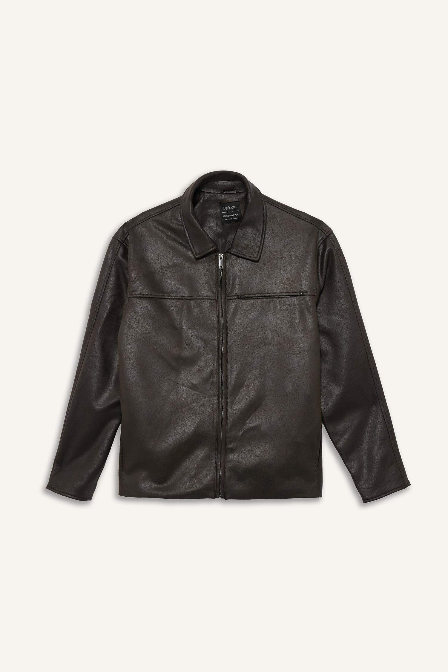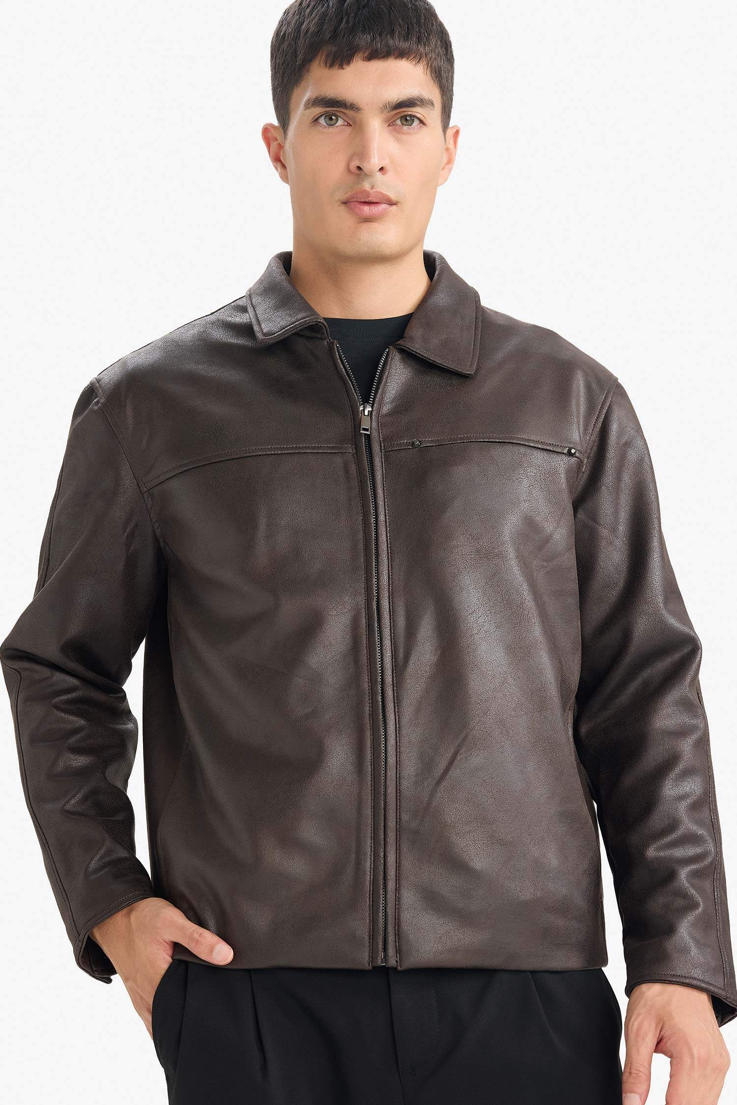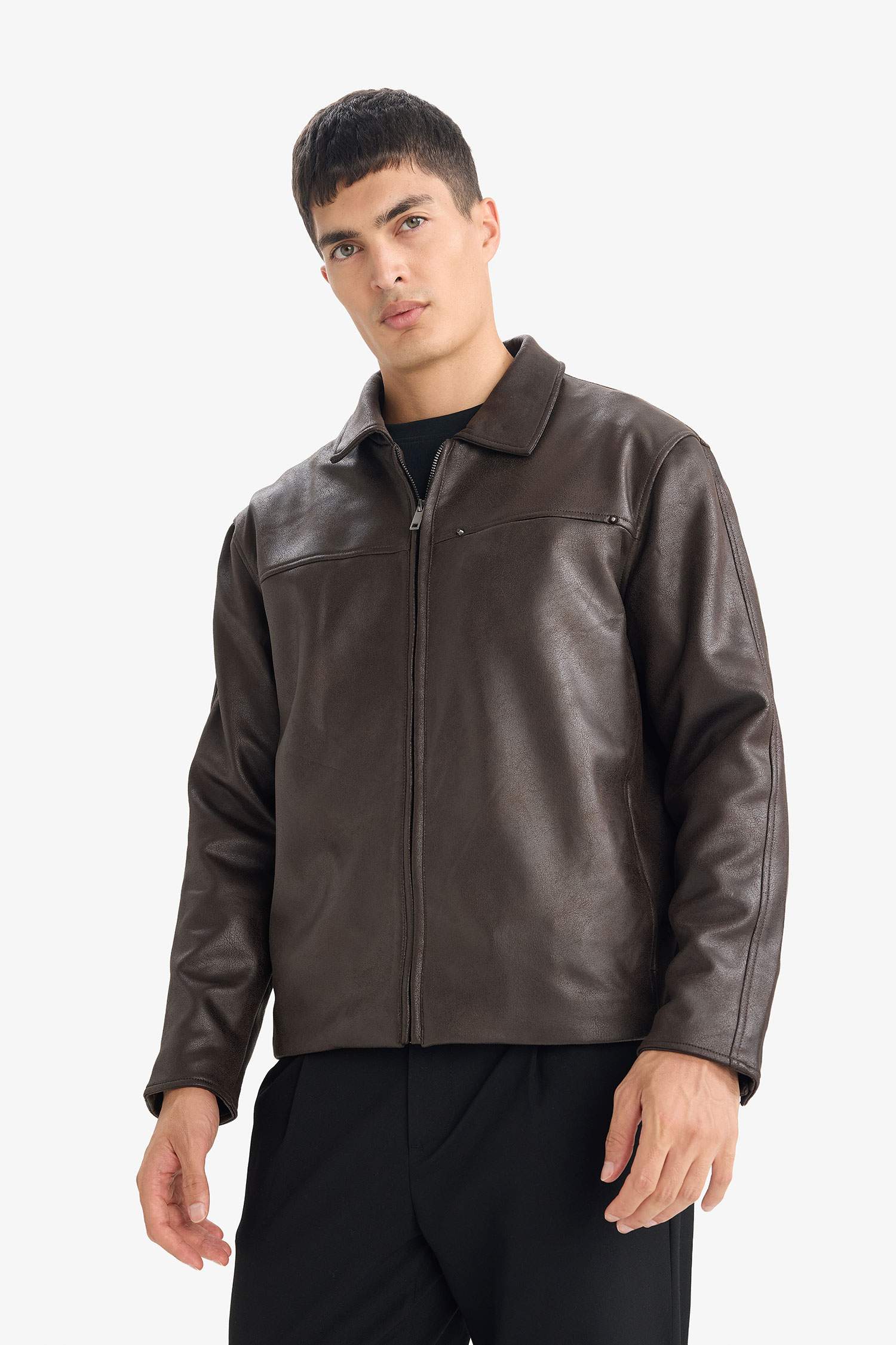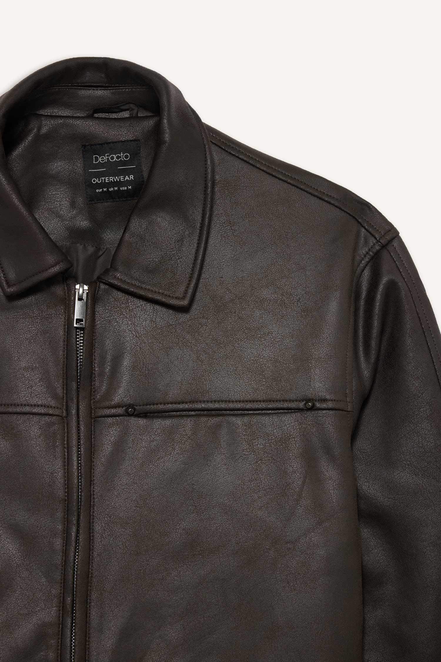 Regular Fit Polo Collar Faux Leather Jacket with Inner Pockets