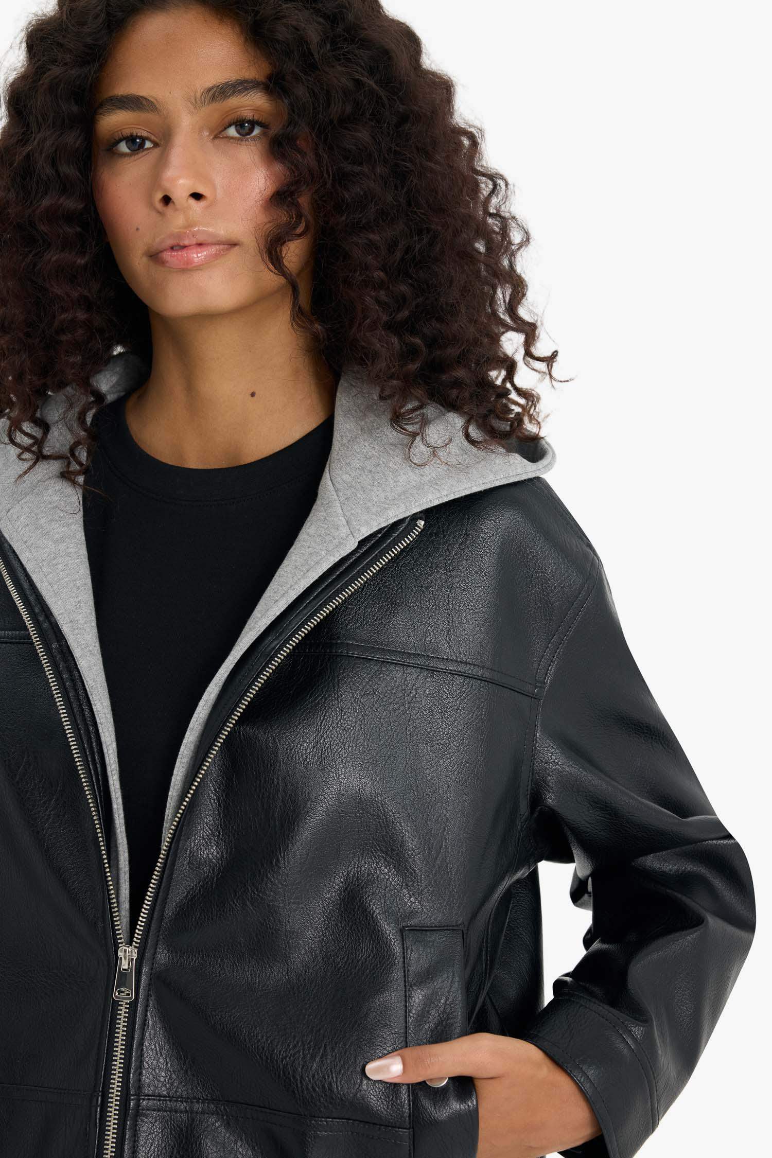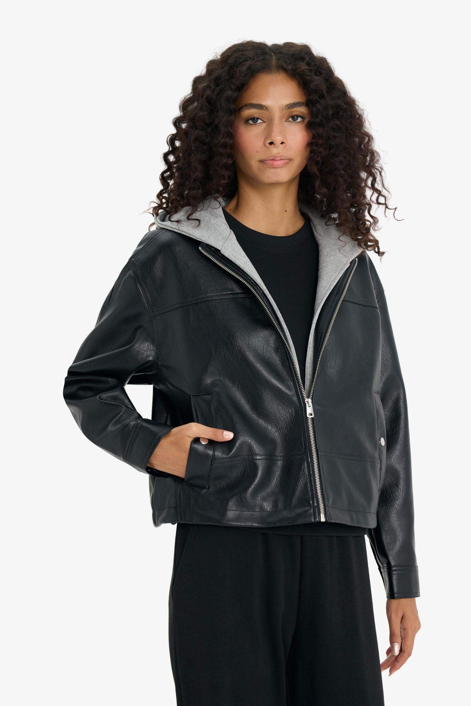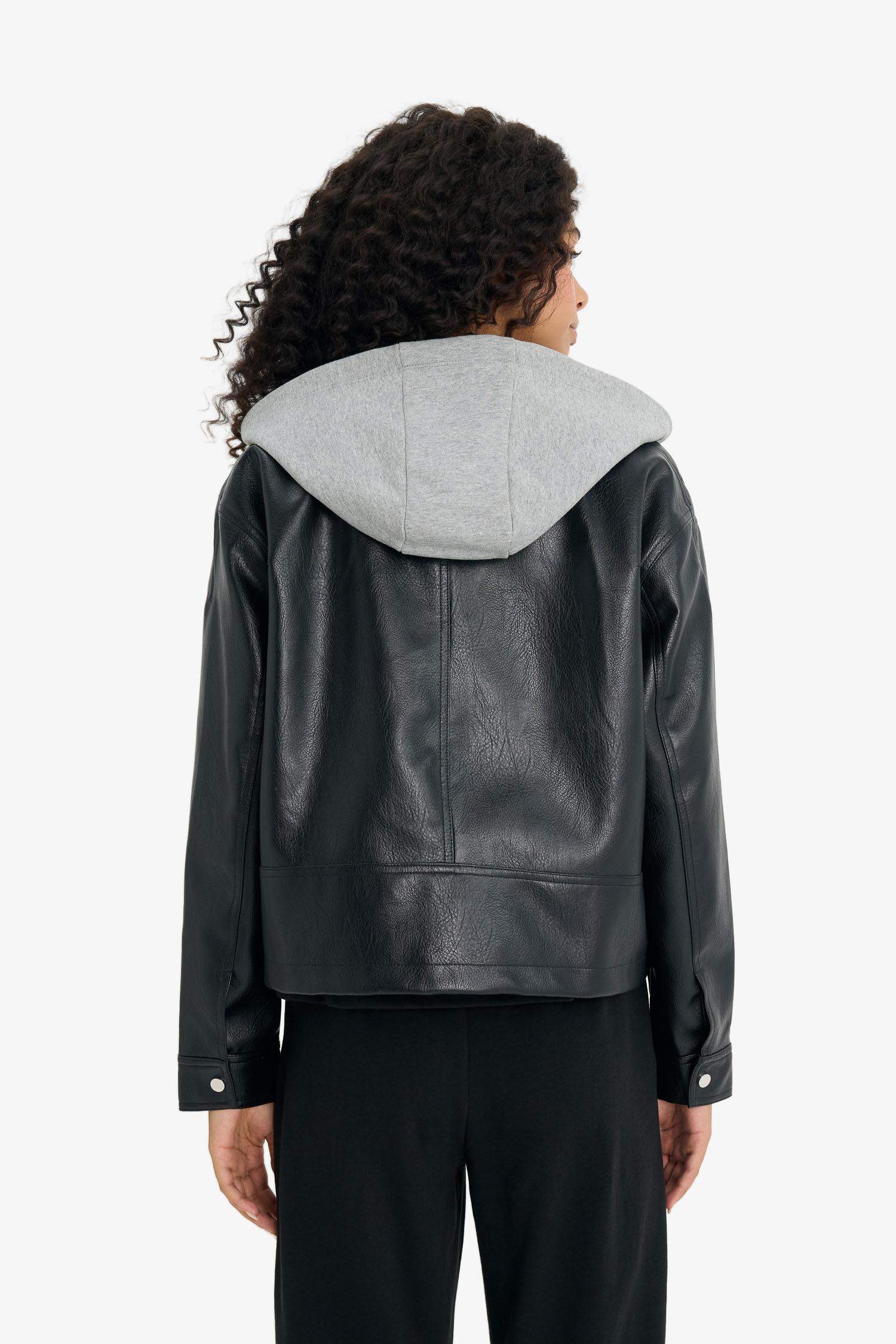 Relax Fit Faux Leather Jacket with Detachable Hood and Zipper