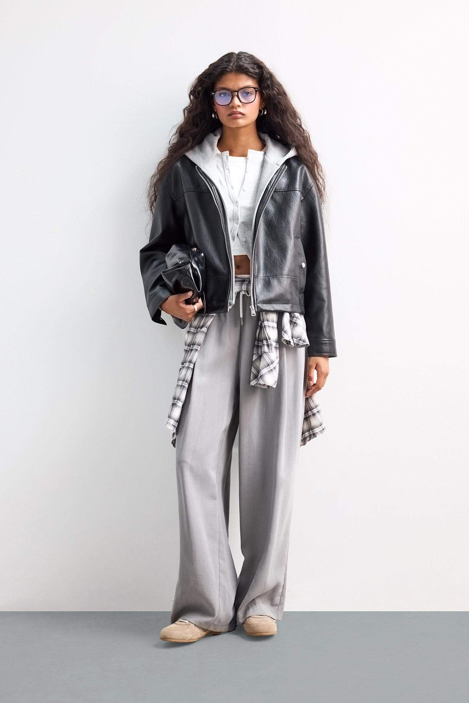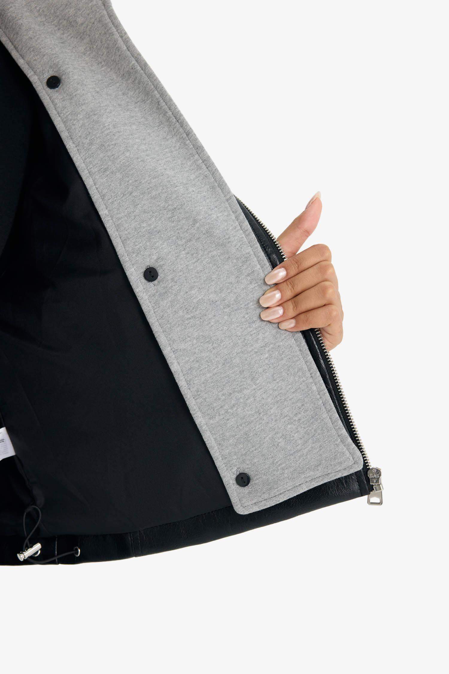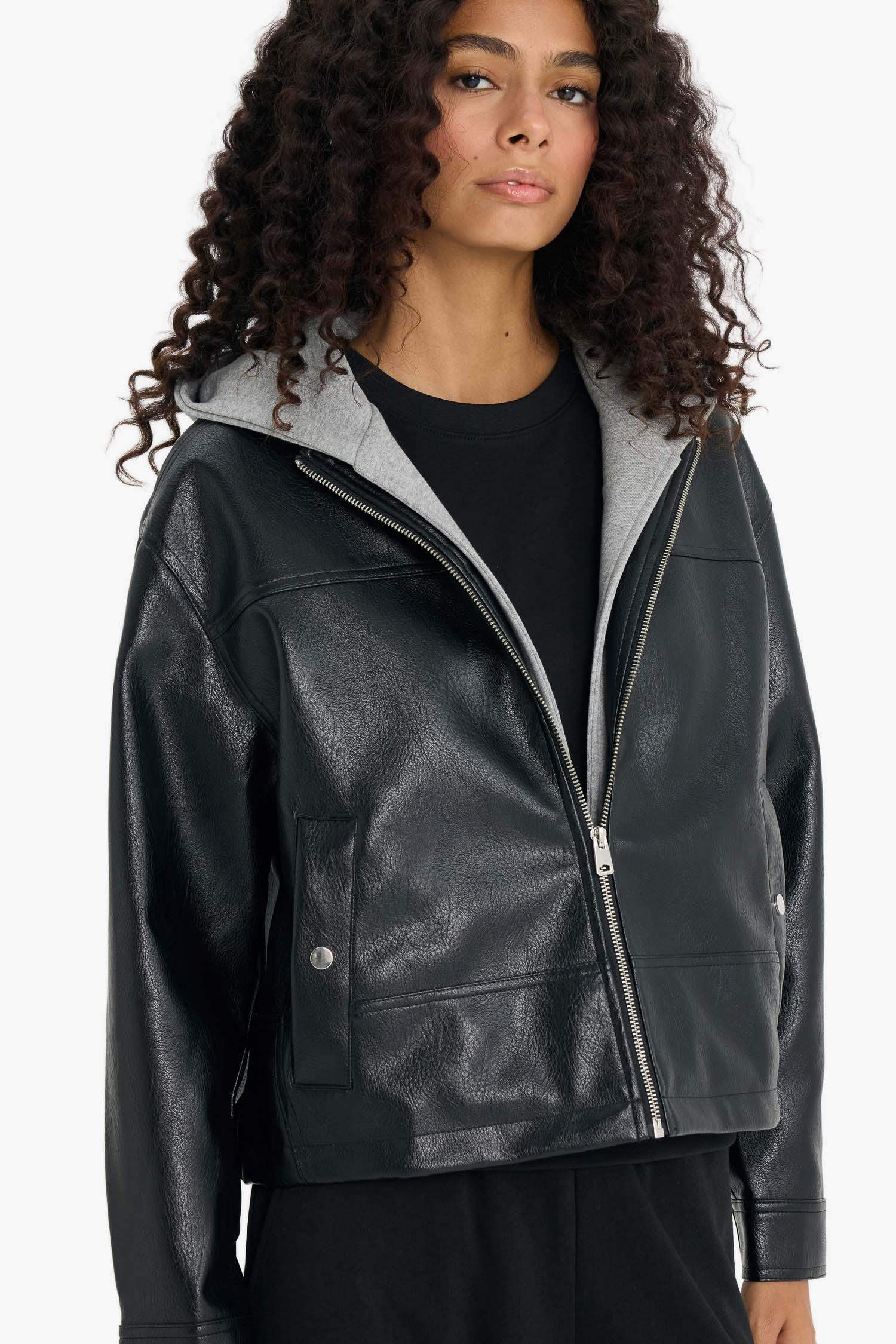 Relax Fit Faux Leather Jacket with Detachable Hood and Zipper