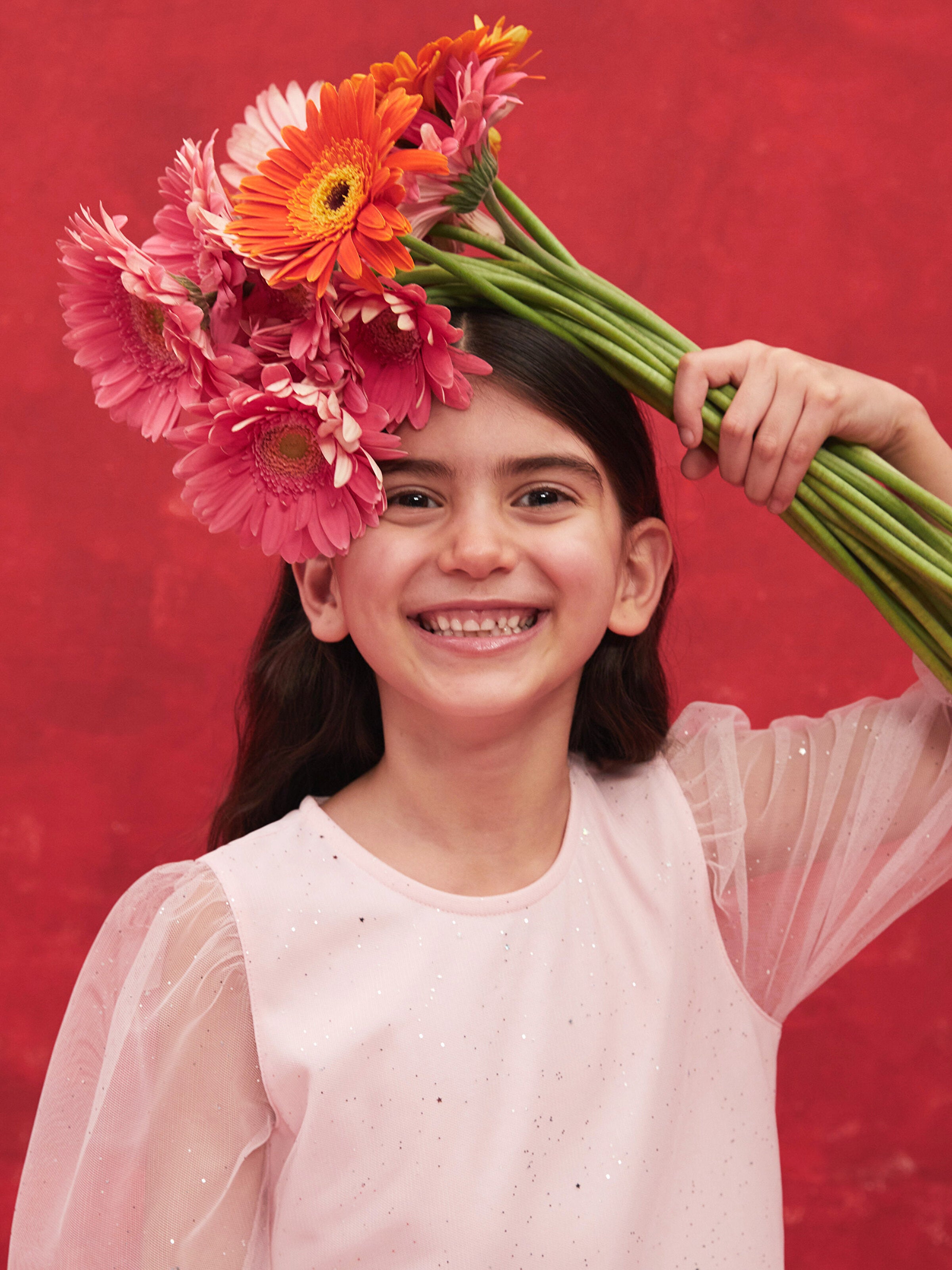 Girls' dress, which will be indispensable for special days, offers elegance and elegance with tulle and ruffle details. It provides practical use thanks to its button -closed structure in the back, while allowing children to make elegant and comfortable combinations.