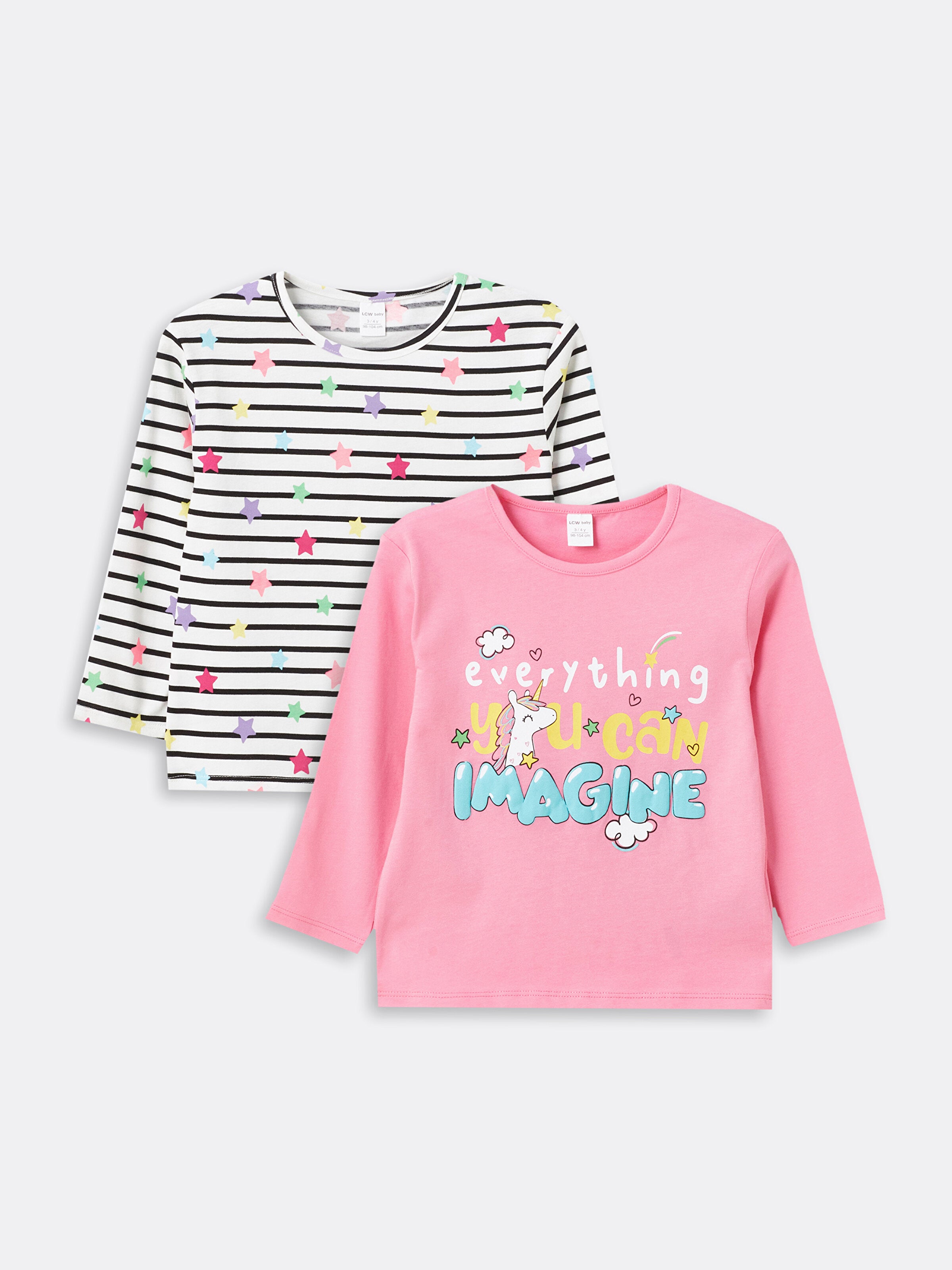 Crew Neck Long Sleeve Baby Girls T-Shirt, Pack Of 2