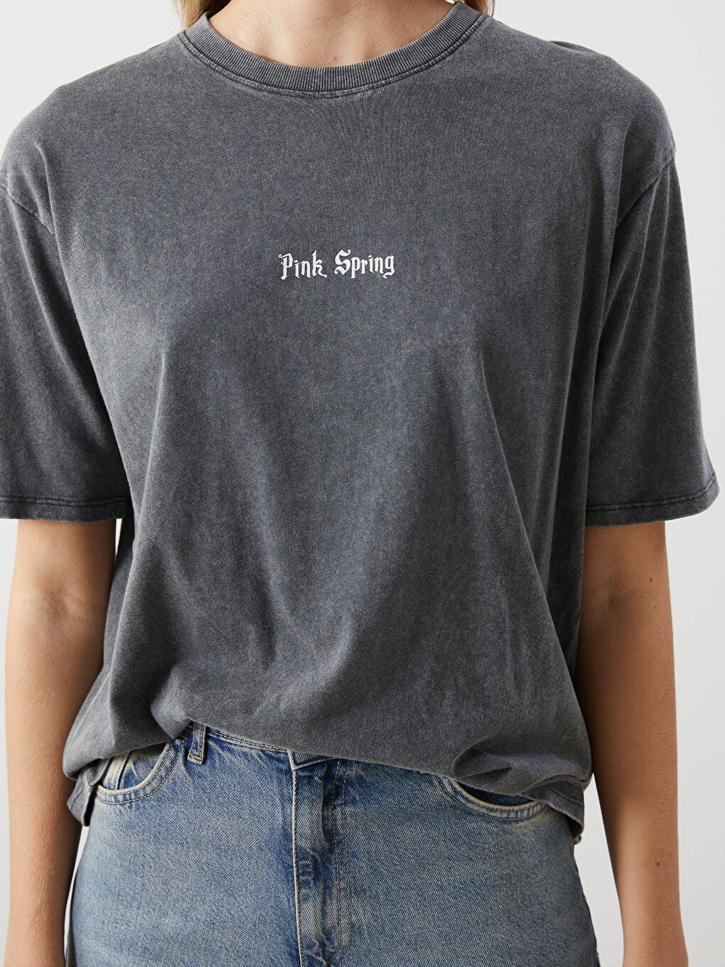 LCW Vision Anthracite Crew Neck Printed Oversize Women T-Shirt