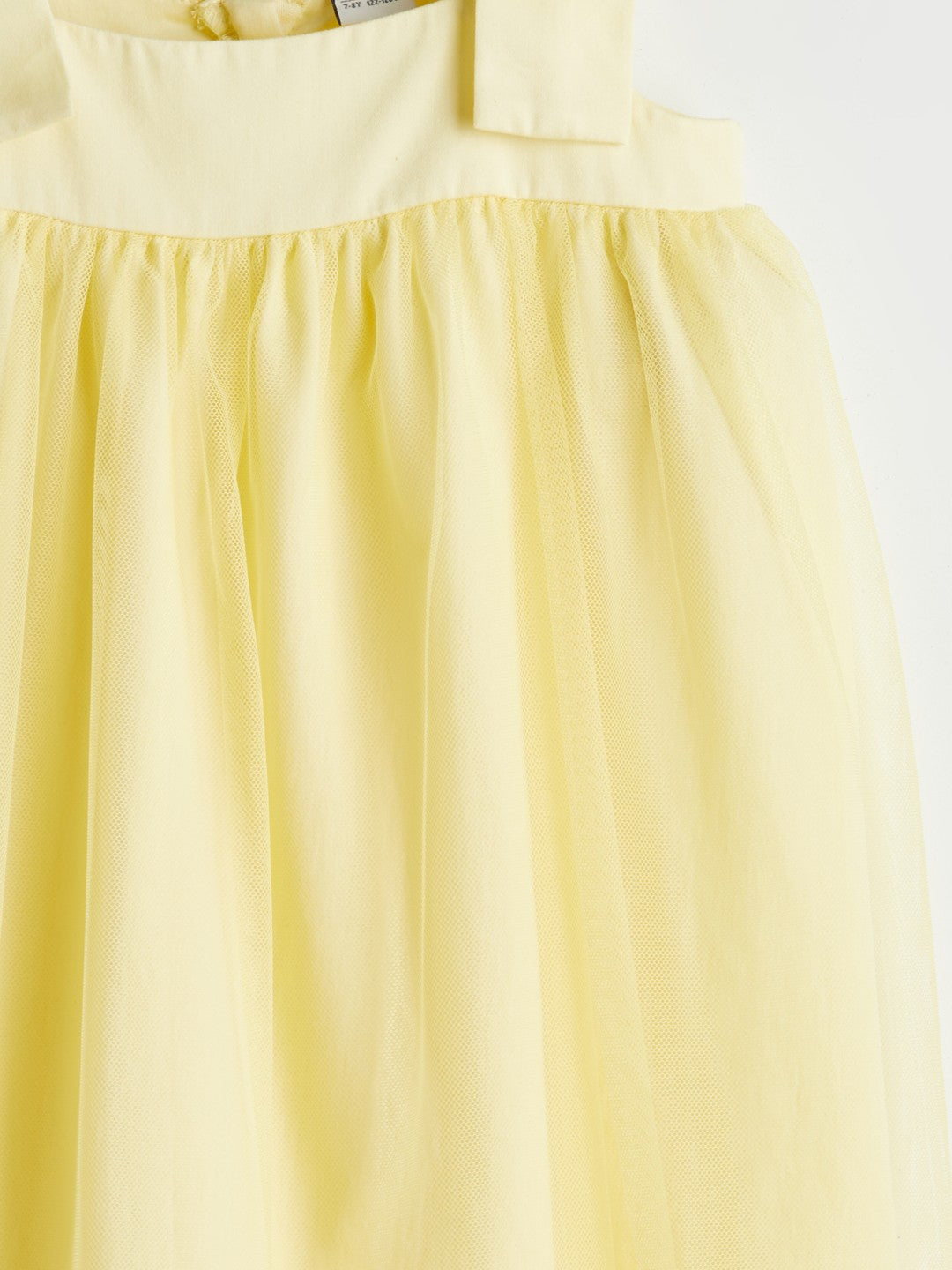 Dress with tulle skirt, bow straps and zipper closure at the back with embroidery details.