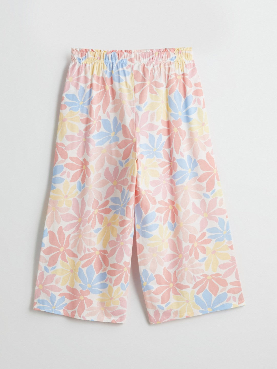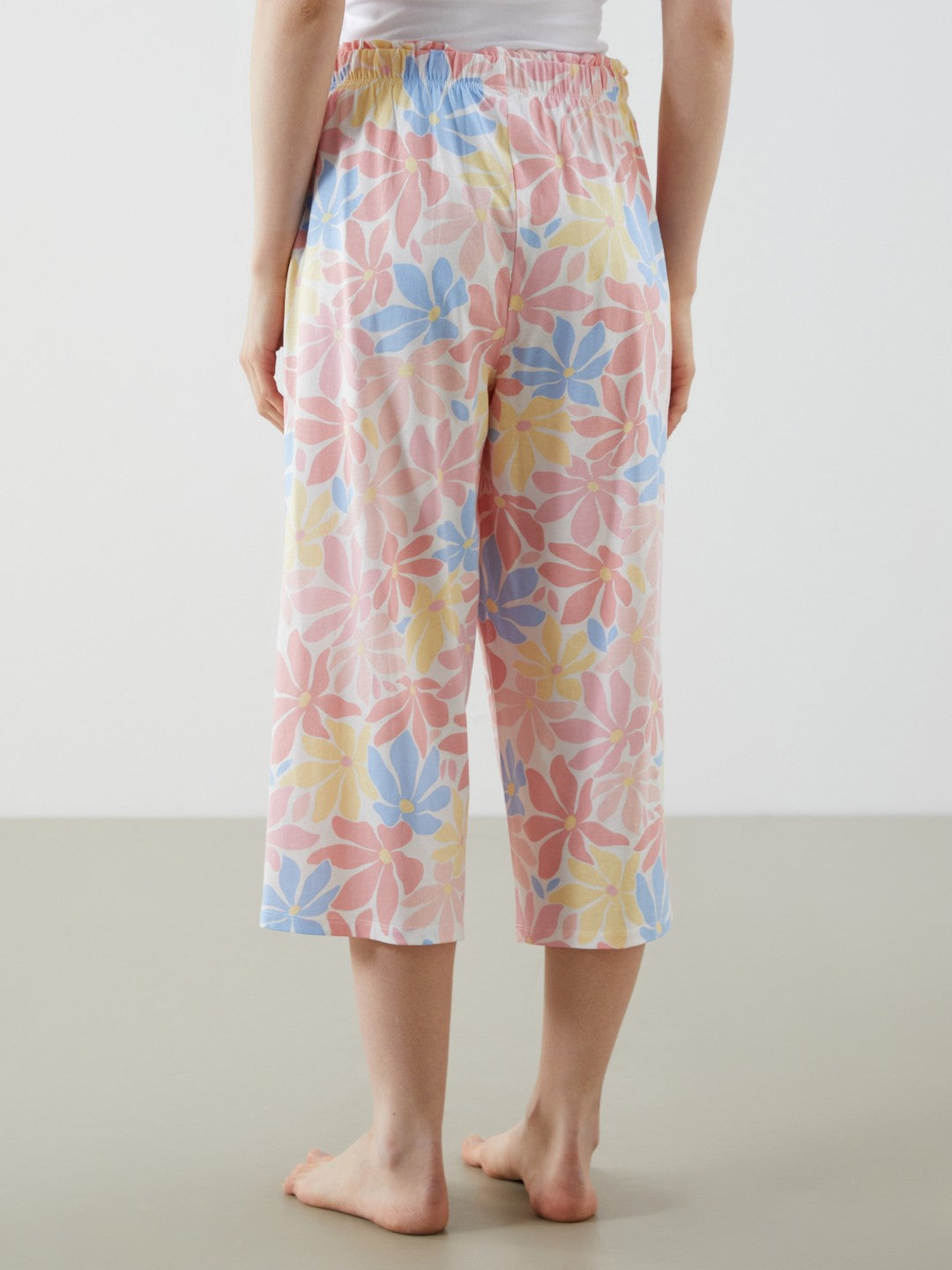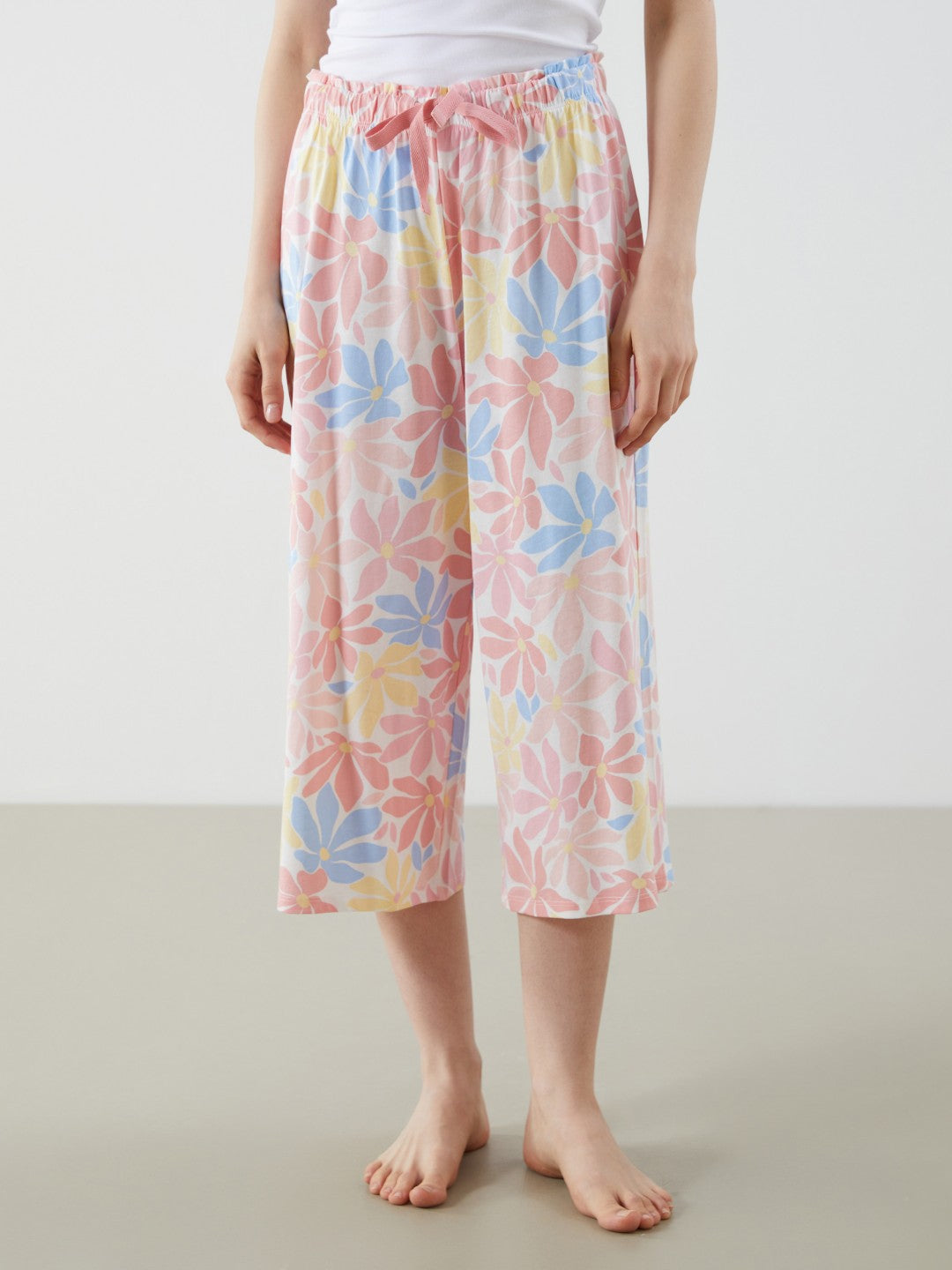 Floral capri pajama bottoms with adjustable drawstring waist. Made of single jersey fabric.