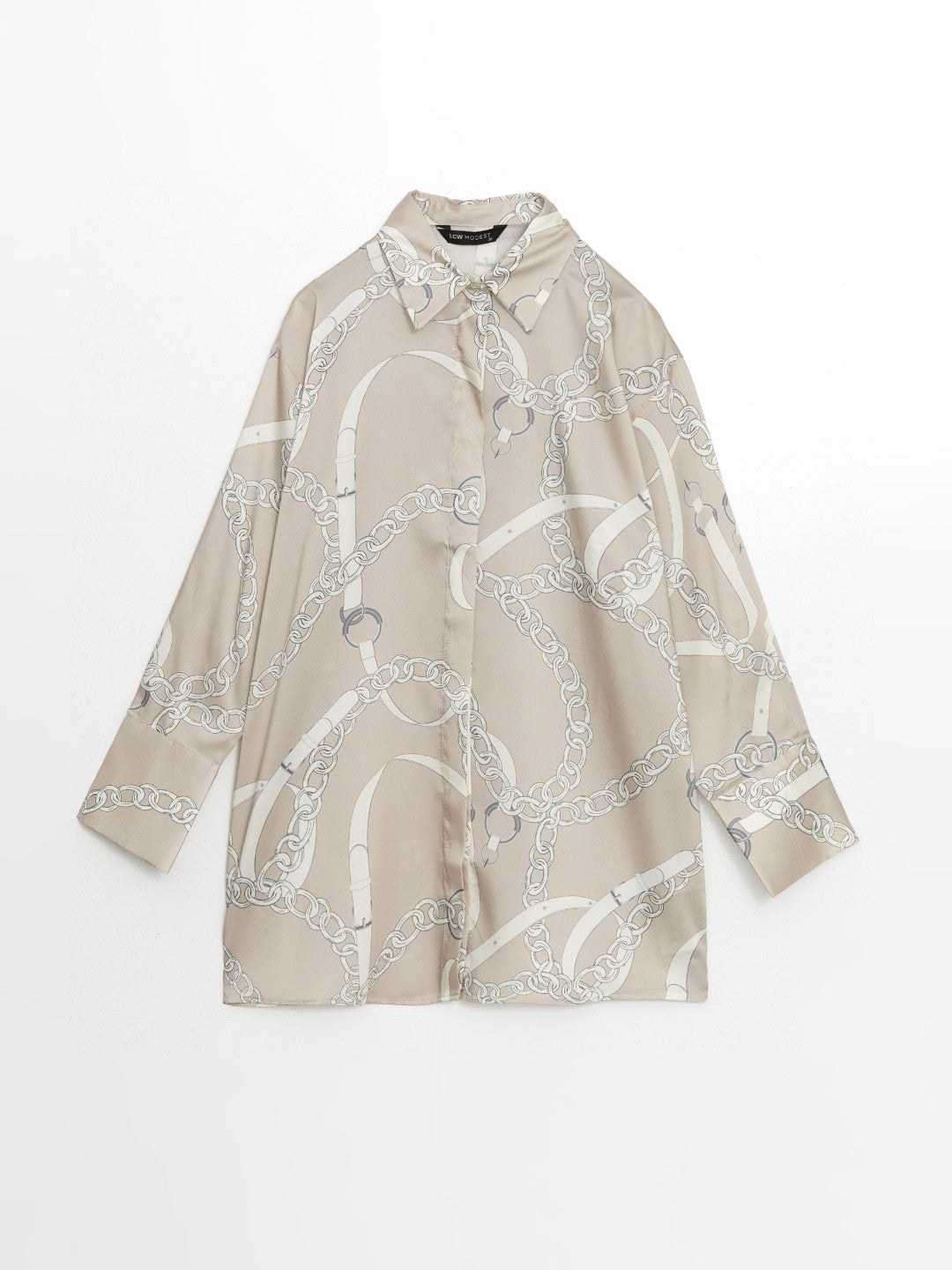 Patterned long sleeve satin women's shirt tunic offers an elegant look. Its shiny and smooth satin fabric provides comfort and a luxurious touch, while its vibrant patterns attract attention at all kinds of events.