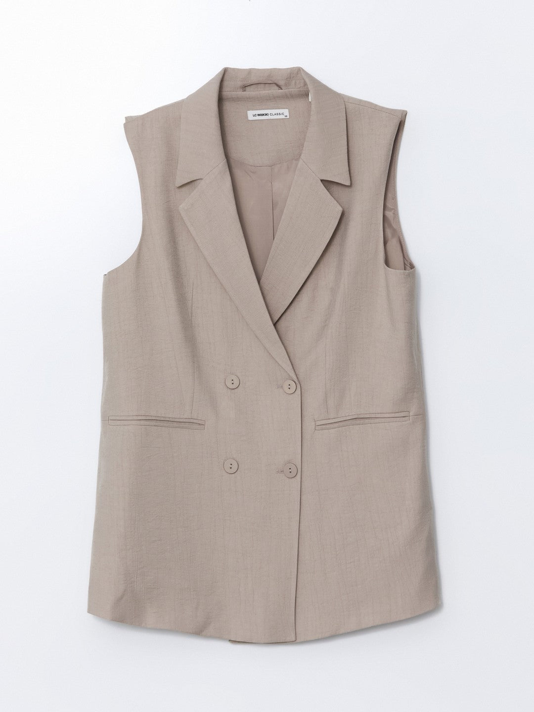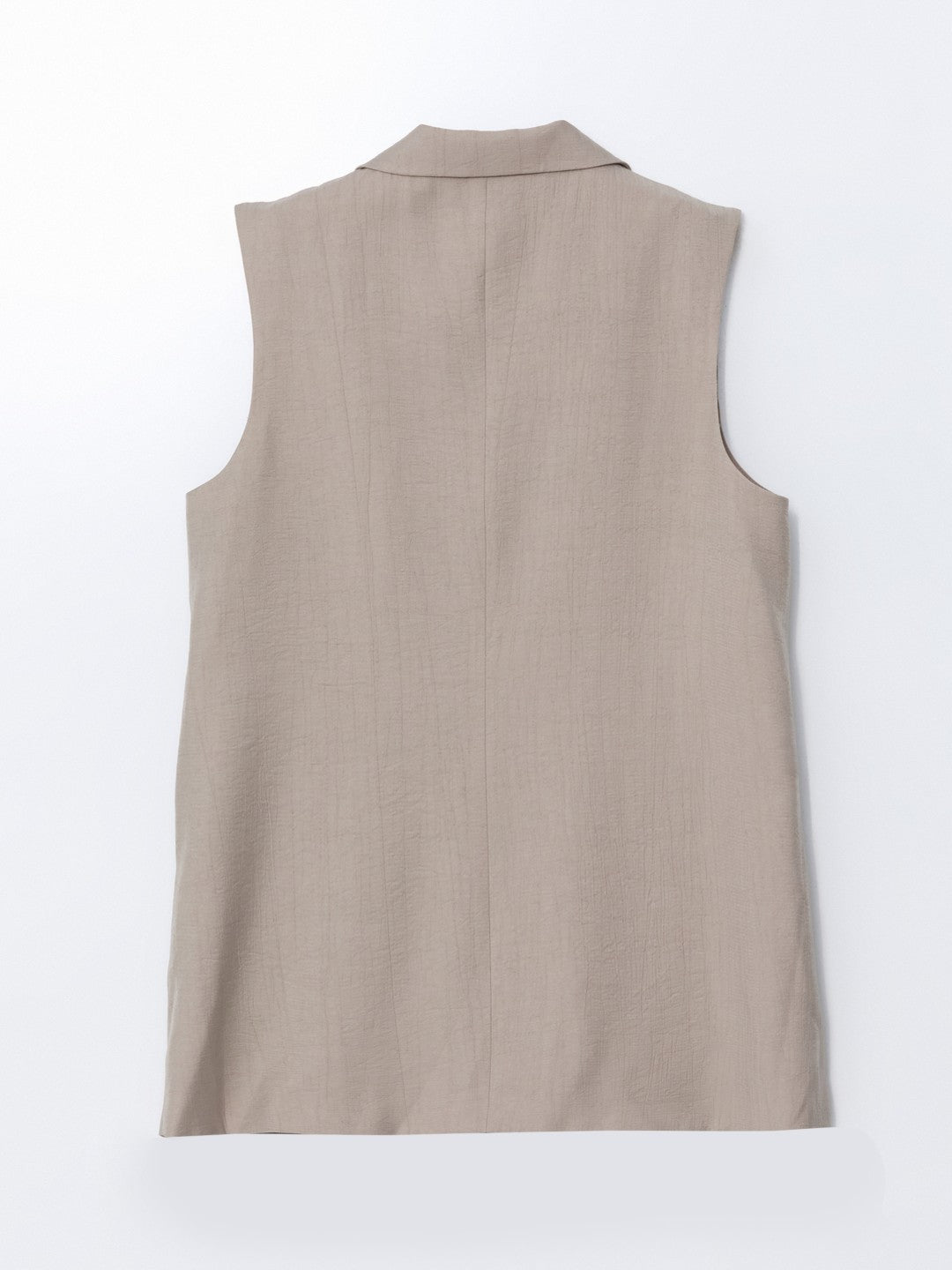 Made from crinkle fabric, this women's vest features a jacket collar and sleeveless design. The double-breasted, button-down design features two front welt pockets.
