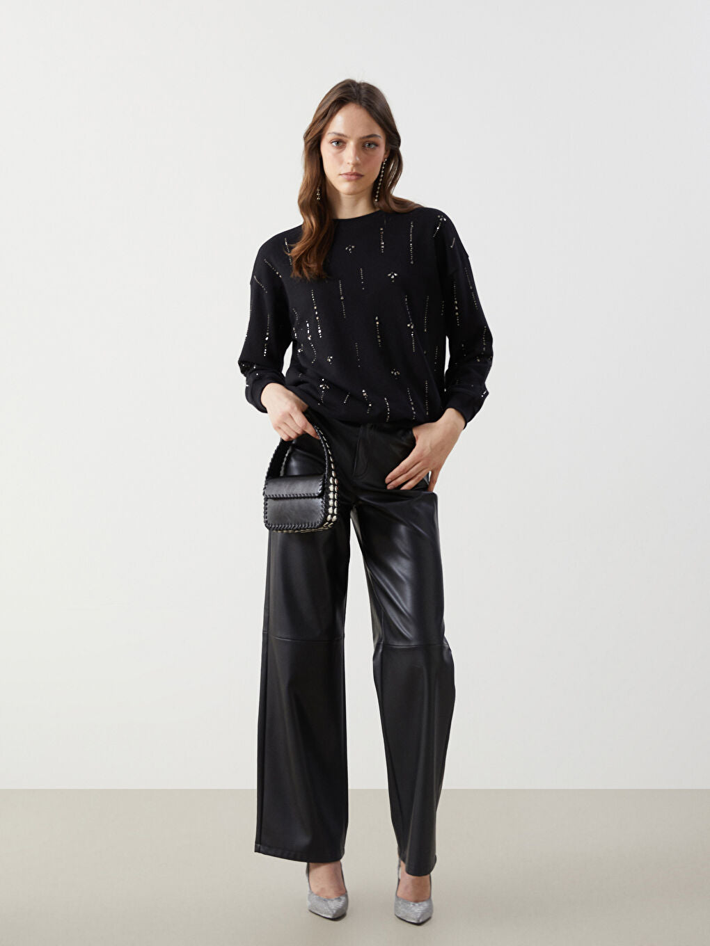 LCW Modest Black Crew Neck Stoned Women Sweatshirt Tunic