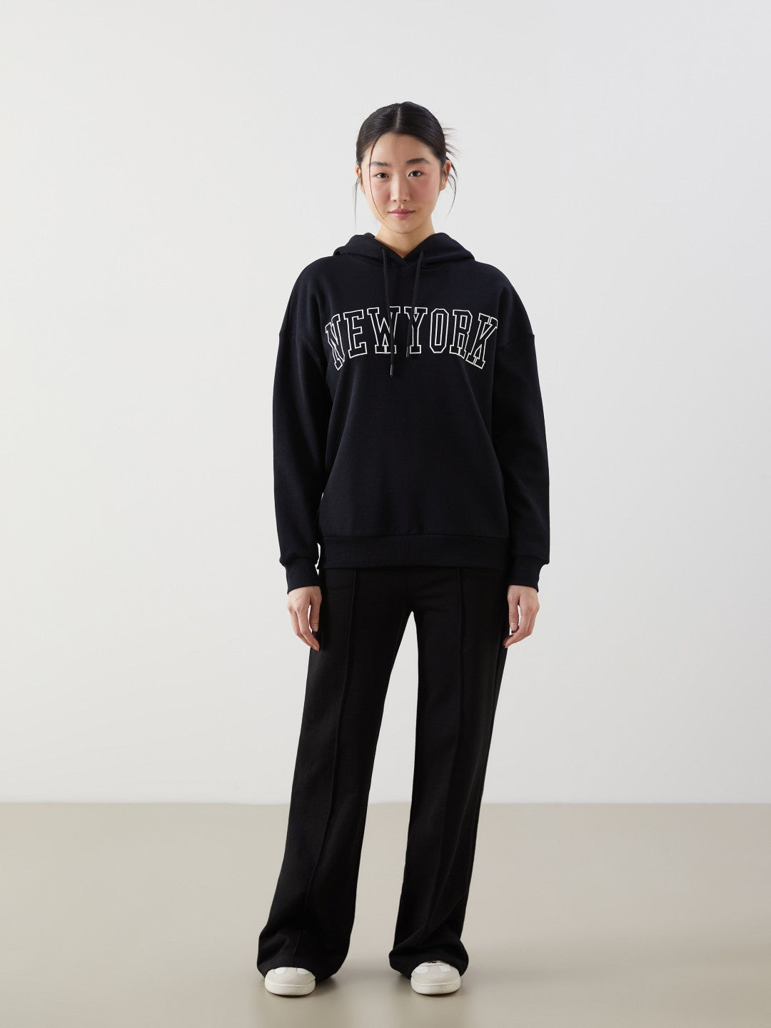 Printed oversize women's hoodie is made of 3-thread raised fabric. The hooded sweatshirt with soft fur inside offers a comfortable wearing experience. It fits the body perfectly thanks to the rib details on the wrist and bottom.