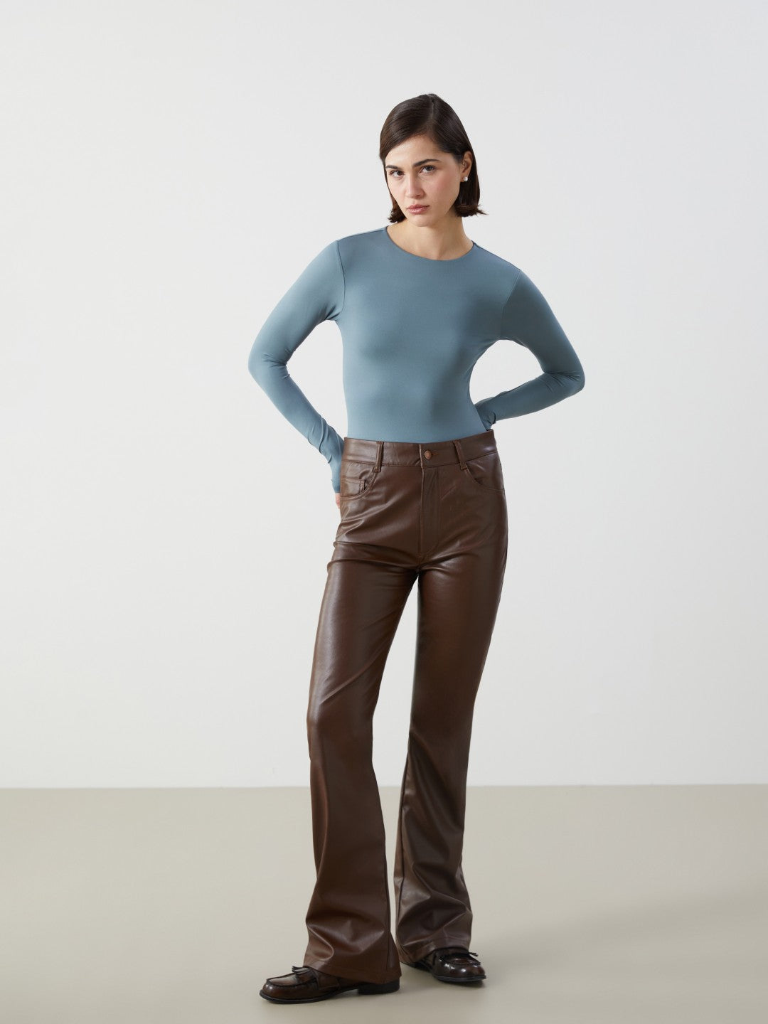 Women's crew neck plain long sleeve bodysuit is made of jersey fabric. It offers comfort all day long with its light and breathable fabric. It creates an elegant silhouette by hugging the body tightly.