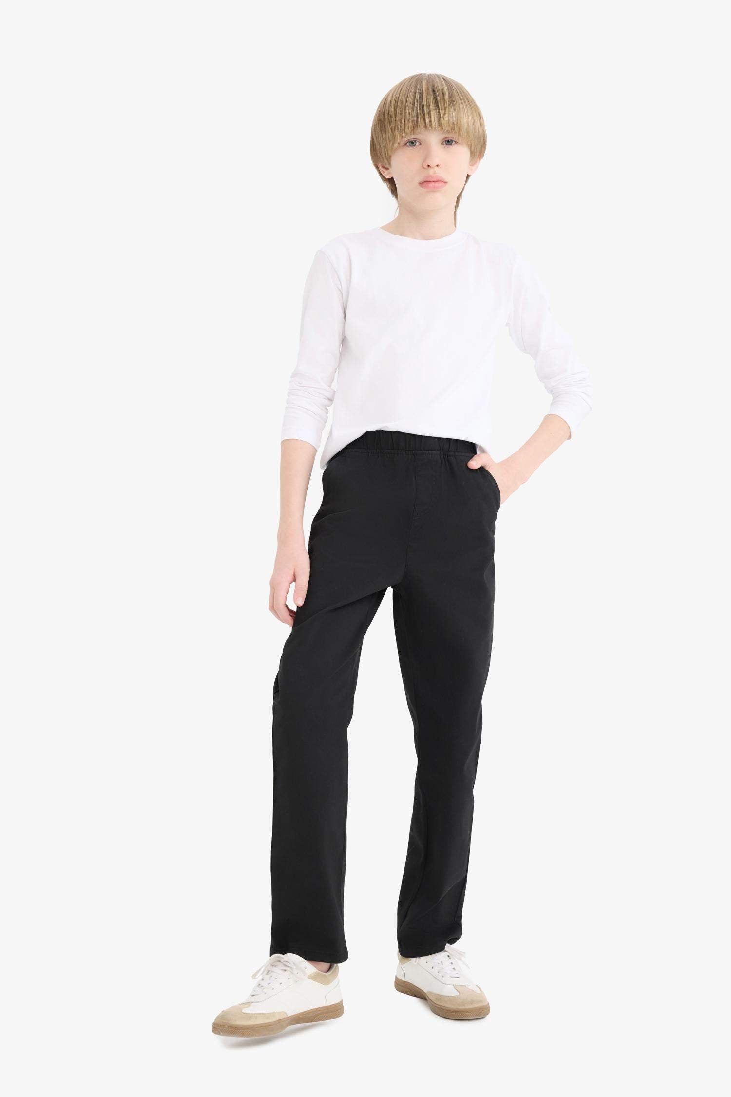 Boys Straight Leg Elastic Waist Pocket Navy Blue Basic Plain Gabardine School Trousers