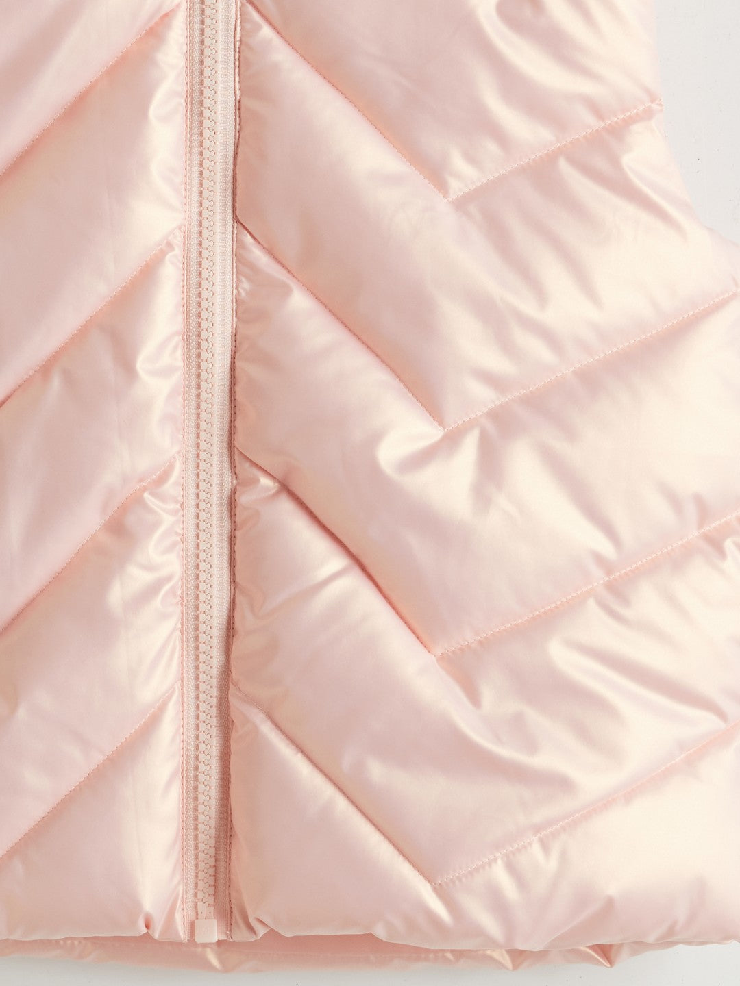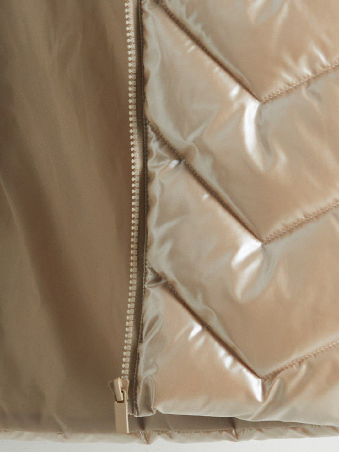 Hooded puffer vest made of water-repellent fabric. Zippered.