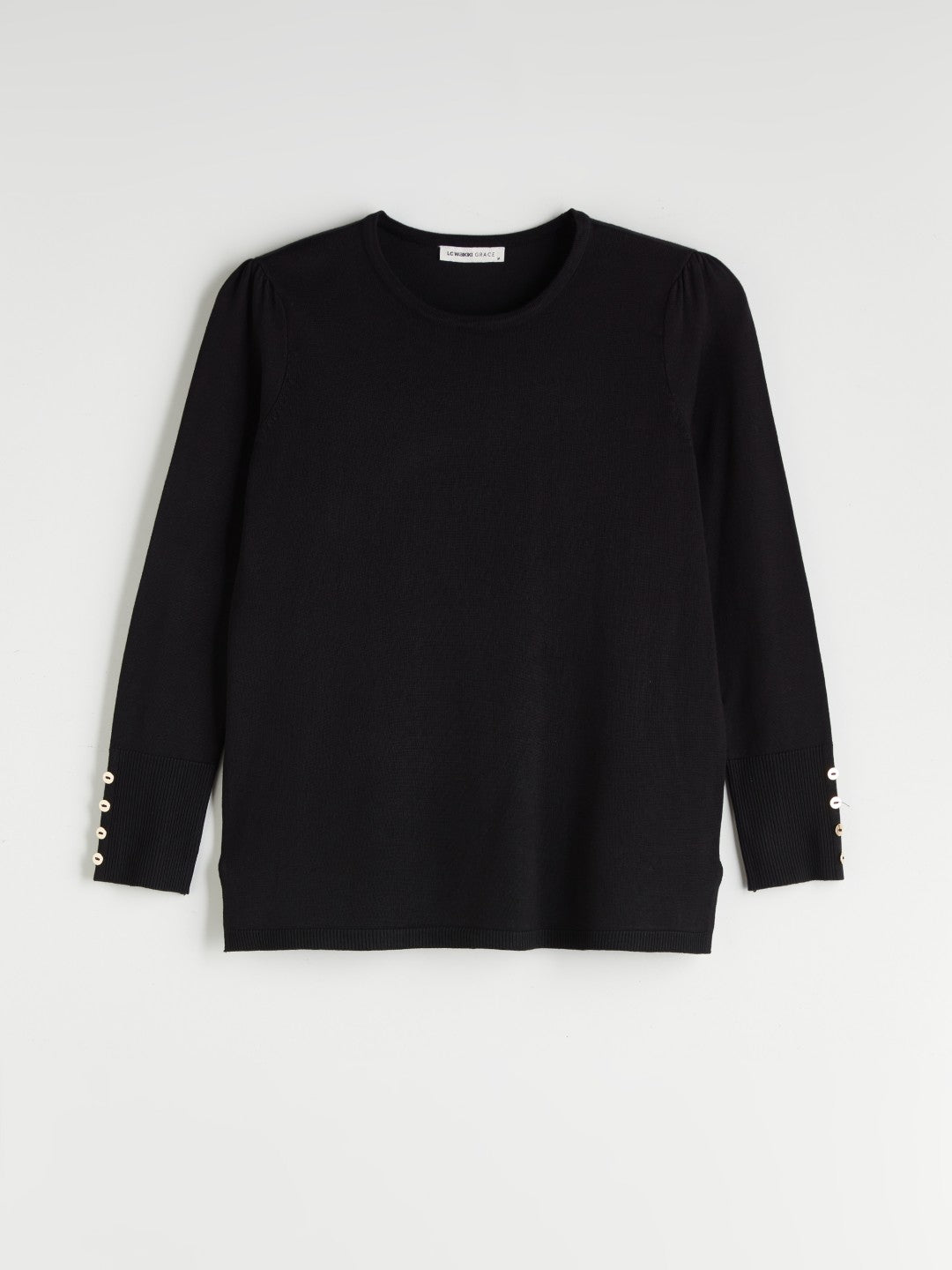 Women crew neck sweater made of knit fabric. Sleeve ends feature decorative button detail.