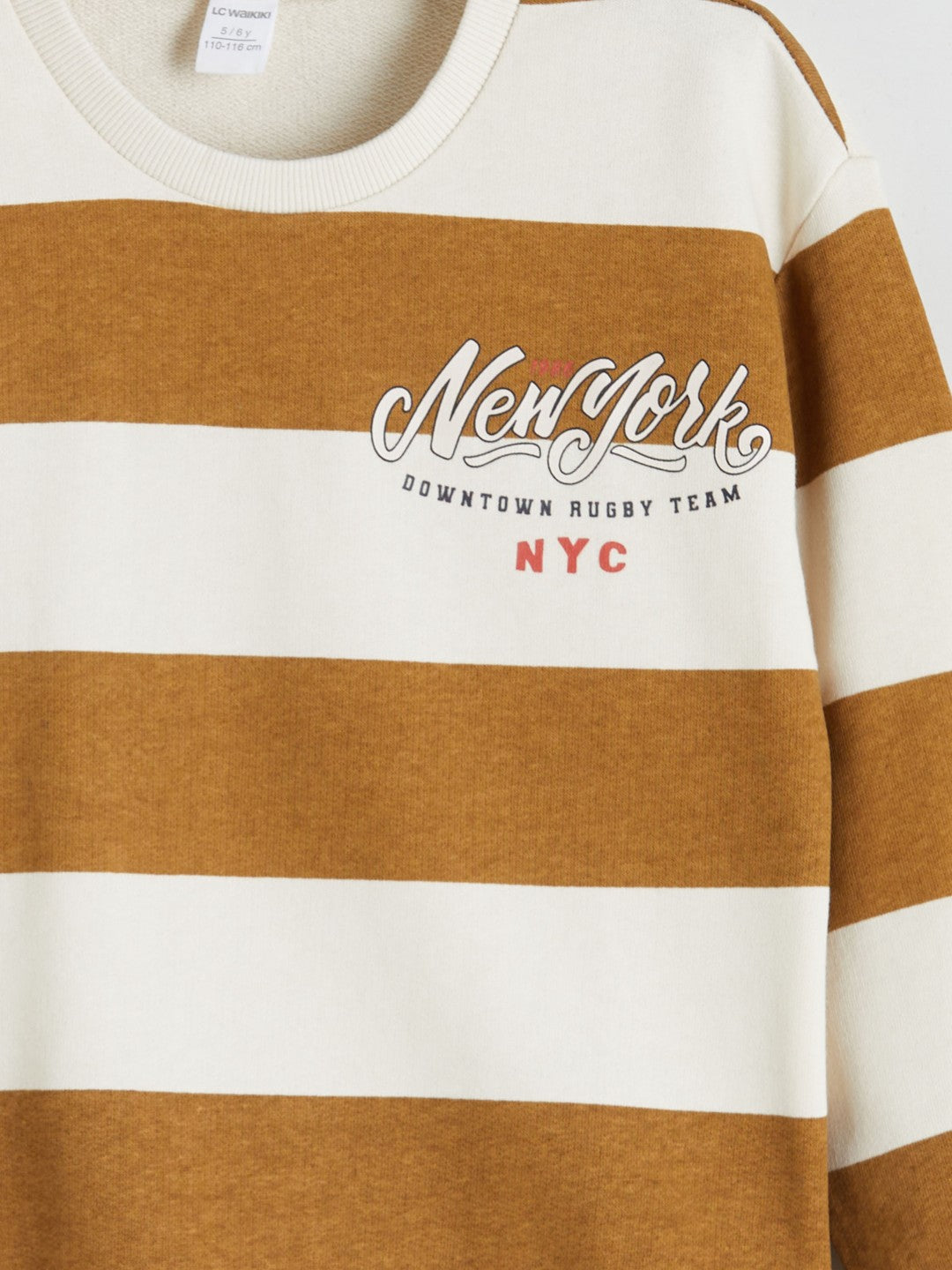 This crew neck, long-sleeved boys sweatshirt is made of 100% cotton, 3-thread fabric. The striped and text-printed model has ribbed sleeves and hem.