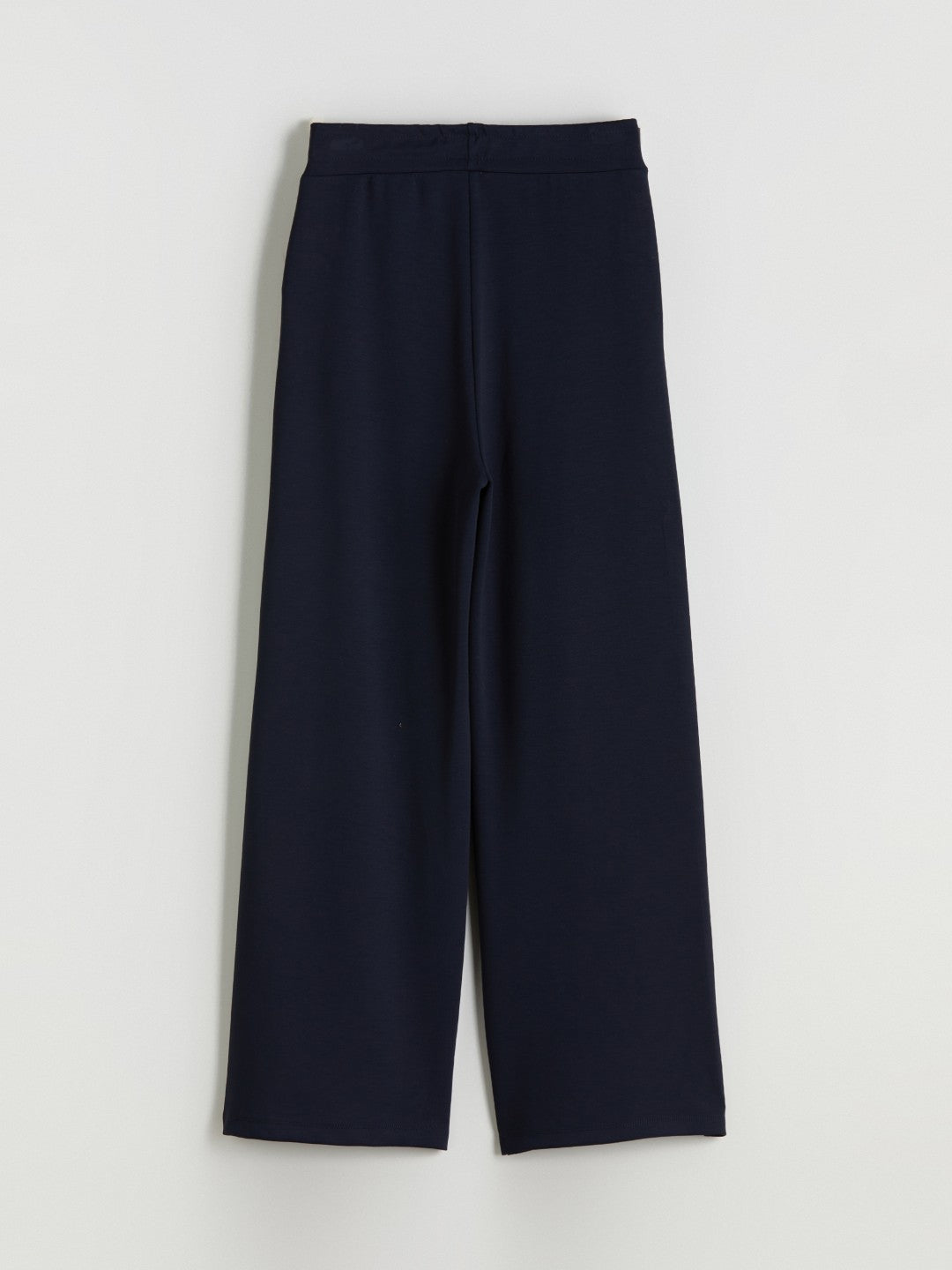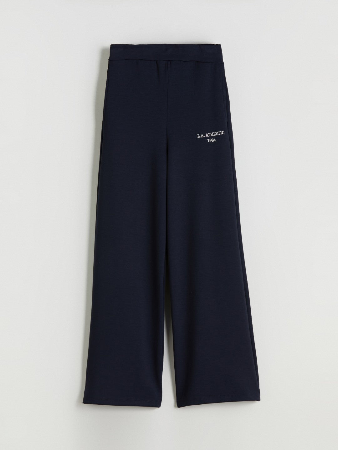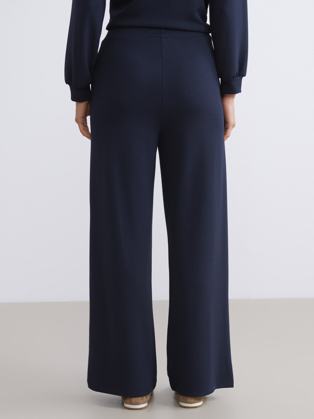 Women tracksuit bottoms with an elastic waistband are made of interlock fabric and feature a wide-leg design.