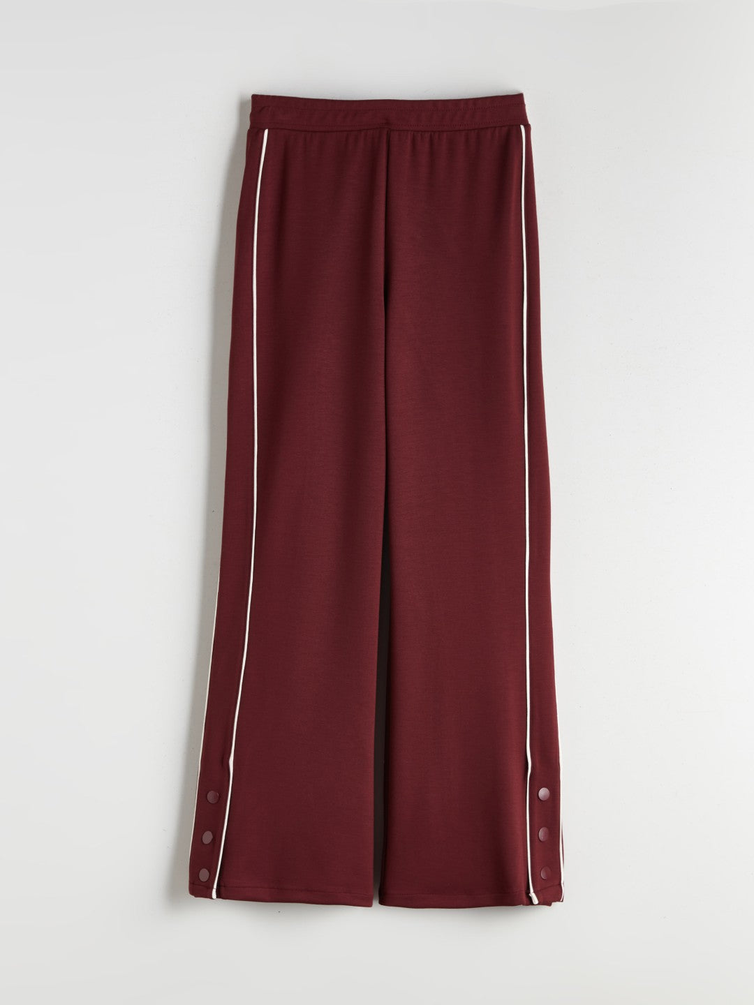 Women tracksuit bottoms with elasticated waist and wide legs are made of medium-thickness interlock fabric; they have side stripes and snap closure on the legs.